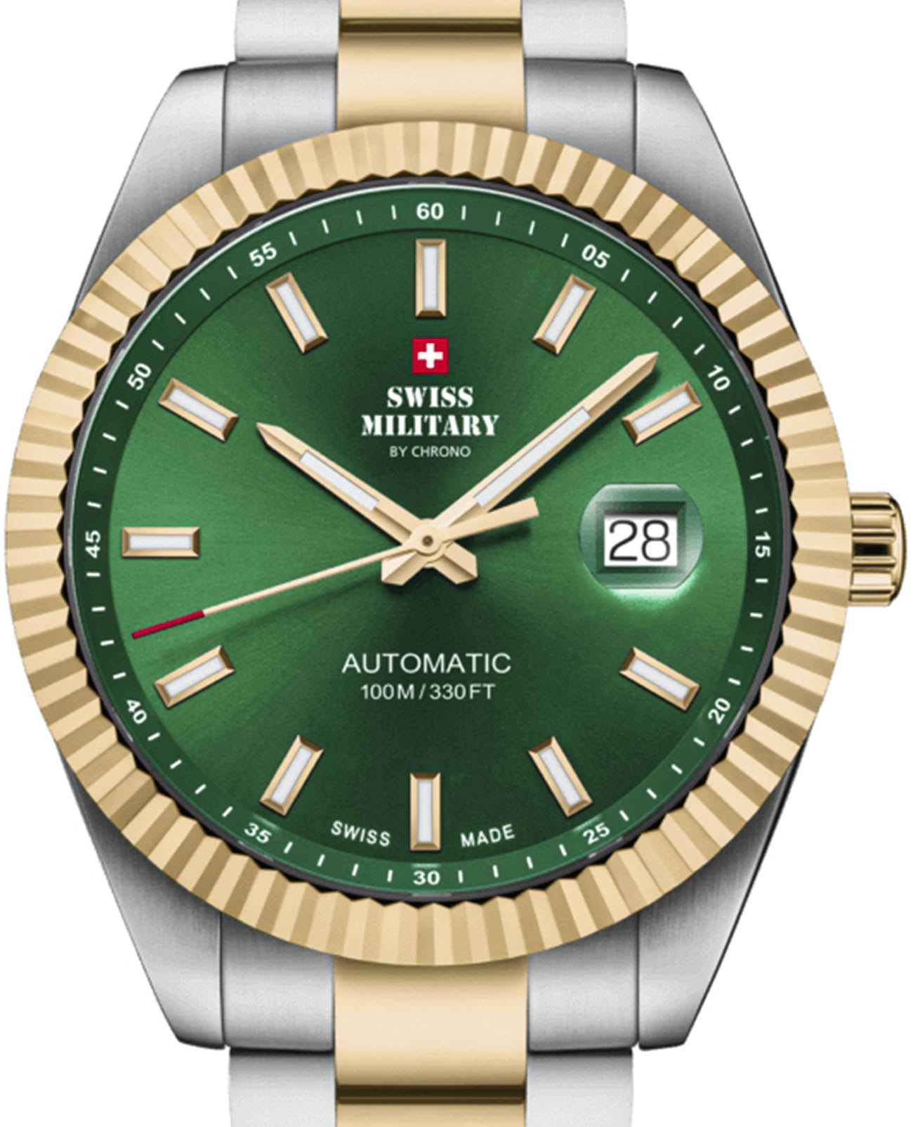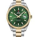 Мужские механические часы с автоподзаводом Swiss Military — это прочный и изысканный аксессуар. Корпус диаметром 40 мм и толщиной 10,8 мм выполнен из нержавеющей стали. БезельБезельВнешний ободок, закрепляющий стекло. В спортивных часах так называется поворотное кольцо с делениями на циферблате, выполняет роль таймера – замеряет отрезки времени на шкале. Неподвижный безель – элемент декора. Однонаправленно вращающийся безель на дайверских часах позволяет фиксировать моменты погружения и выныривания на поверхность. с PVD-покрытиемPVDУльтратонкое покрытие наносится в технике вакуумного напыления, сочетает в себе нитрид титана особой прочности со слоем золота или оксида хрома. Несёт в себе декоративную или защитную функцию.. Циферблат зелёного цвета оформлен индексами, стрелками и апертурой даты в положении 3 часов с увеличительным стеклом (Cyclops). Стрелки и метки с люминесцентным покрытиемЛюминесцентное покрытиеПозволяет считывать показания времени в темноте. Производители наносят на стрелки, часовые индексы, безель или поверхность циферблата светонакопительный состав, дающий холодное свечение., обеспечивающим хорошую читаемость в темноте. Циферблат защищён сапфировым стекломСапфировое стеклоПрочный и надёжный материал из кристалла сапфира синтетического происхождения, характеризующийся особой твёрдостью и устойчивостью к царапинам и повреждениям.. Механизм — швейцарское автоматическое движение калибра Sellita SW200 (Swiss Made). Часы оснащены стальным браслетом с частичным PVD-покрытиемPVDУльтратонкое покрытие наносится в технике вакуумного напыления, сочетает в себе нитрид титана особой прочности со слоем золота или оксида хрома. Несёт в себе декоративную или защитную функцию. на раскладной застёжкеРаскладная застёжкаТакой тип застёжки используется только на браслетах из металла. Она никогда не раскрывается полностью, происходит разделение на 2 и более частей. Раскладывающая застёжка снизит вероятность потери часов к минимуму.. Водонепроницаемость 100 м позволяет использовать часы для плавания и повседневного ношения. Идеальный выбор для тех, кто ценит швейцарское качество и универсальный дизайн.