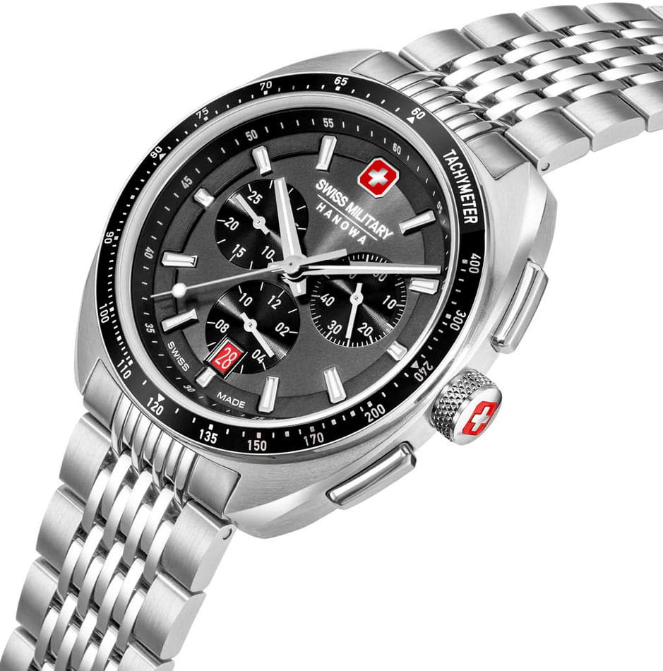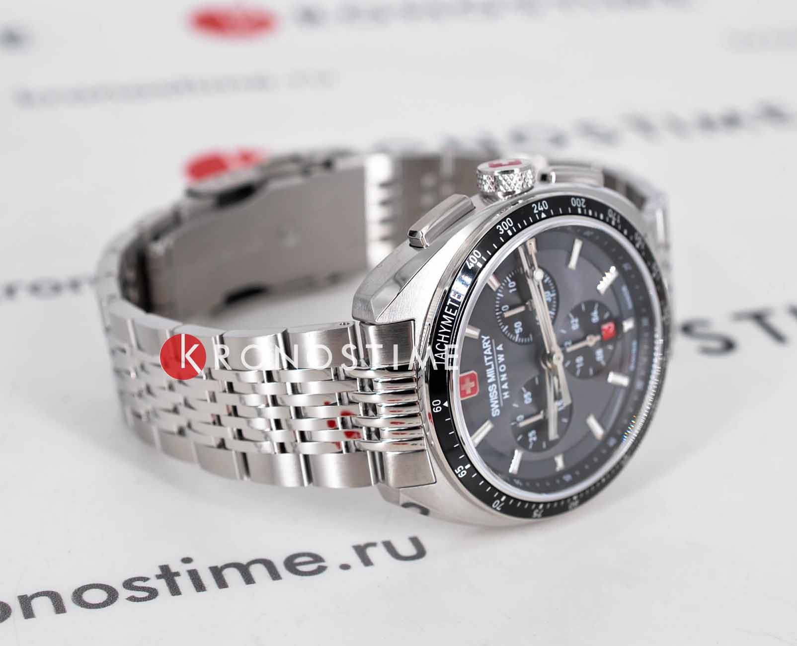 Мужские швейцарские часы-хронографХронографФункция позволяет измерять отрезки времени с особой точностью: часы, минуты, секунды. Верным признаком хронографа является наличие на циферблате 3 дополнительных окошек-счётчиков. Swiss Military Hanowa SMWGI0003302, кварцевый механизм с высокой точностью. Сапфировое стеклоСапфировое стеклоПрочный и надёжный материал из кристалла сапфира синтетического происхождения, характеризующийся особой твёрдостью и устойчивостью к царапинам и повреждениям. устойчивое к появлению царапин, обладающее высокой прозрачностью. Класс водозащиты: 100 метров, позволит плавать, нырять и заниматься другими водными видами спорта. Корпус часов изготовлен из стали. Стальной браслет на раскладной застёжкеРаскладная застёжкаТакой тип застёжки используется только на браслетах из металла. Она никогда не раскрывается полностью, происходит разделение на 2 и более частей. Раскладывающая застёжка снизит вероятность потери часов к минимуму.. БезельБезельВнешний ободок, закрепляющий стекло. В спортивных часах так называется поворотное кольцо с делениями на циферблате, выполняет роль таймера – замеряет отрезки времени на шкале. Неподвижный безель – элемент декора. Однонаправленно вращающийся безель на дайверских часах позволяет фиксировать моменты погружения и выныривания на поверхность. с тахиметромТахиметрРазмеченная шкала, располагается на ободке или безеле часов. Тахиметр позволяет рассчитать скорость на определённом участке пути, расстояние измеряется в километрах или милях. изготовлен из нержавеющей стали с IP-покрытиемIP-покрытиеМетод ионного напыления. Демонстрирует повышенную устойчивость к истиранию, окислению и химическим веществам. Под воздействием высокого давления и температуры около 1500°C молекулы металла надёжно соединяются с частицами корпуса часов..