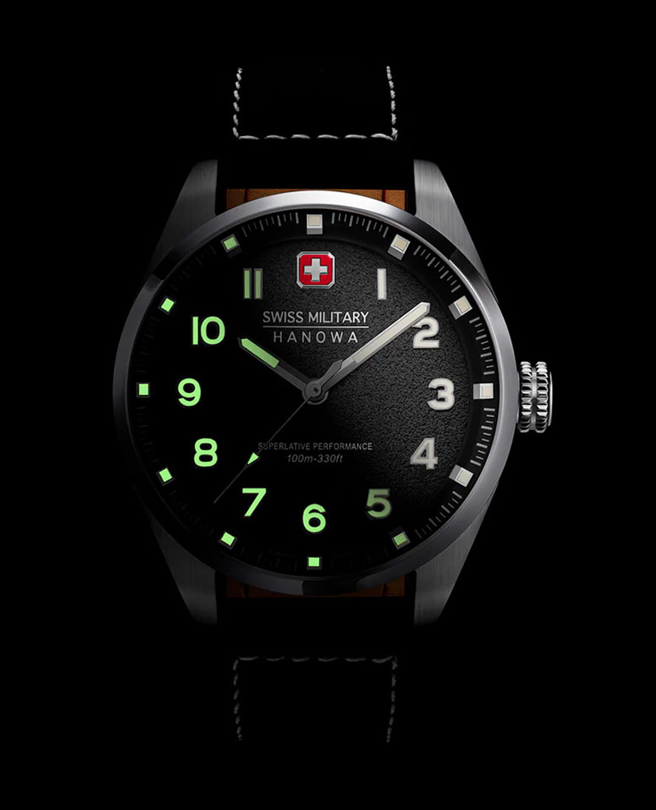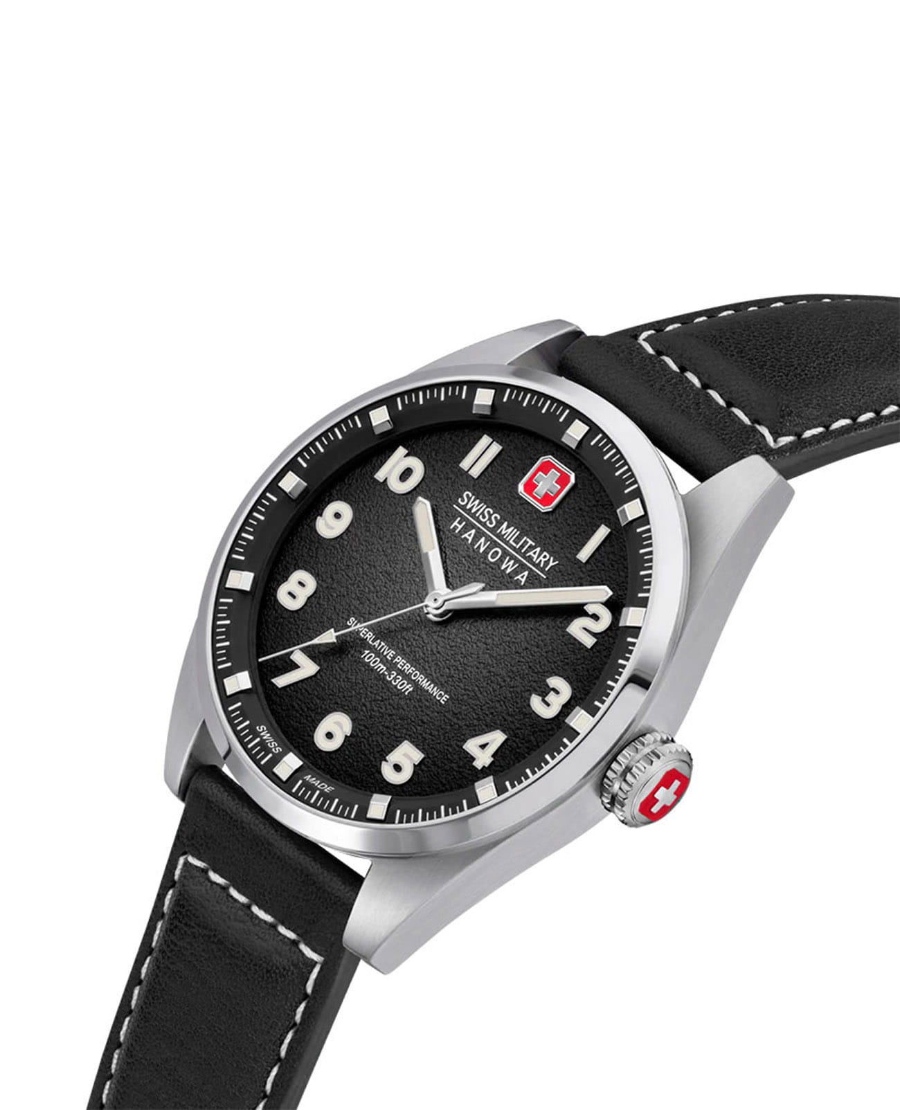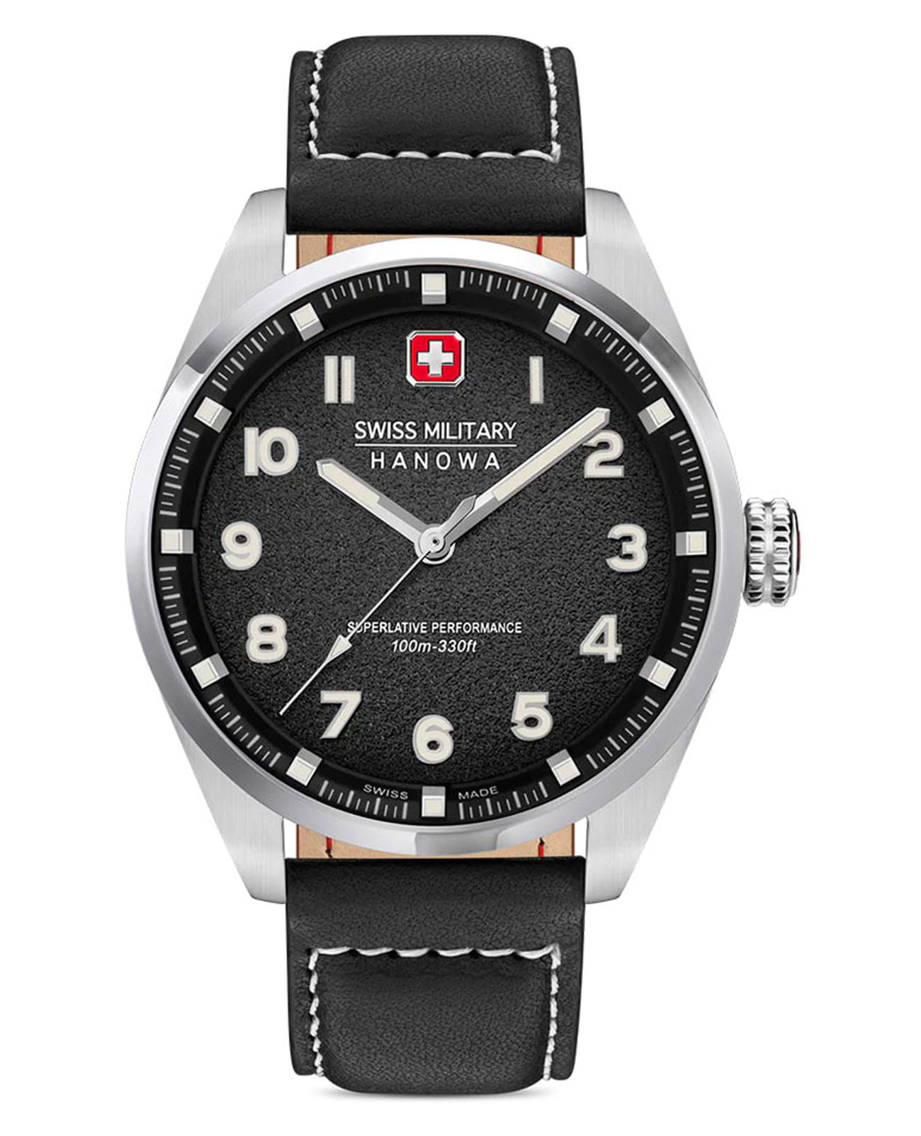 Мужские швейцарские часы Swiss Military Hanowa Greyhound SMWGA0001501, кварцевый механизм с высокой точностью. Сапфировое стеклоСапфировое стеклоПрочный и надёжный материал из кристалла сапфира синтетического происхождения, характеризующийся особой твёрдостью и устойчивостью к царапинам и повреждениям. устойчивое к появлению царапин, обладающее высокой прозрачностью. Корпус часов изготовлен из нержавеющей стали. Стрелки и цифры с люминесцентным покрытиемЛюминесцентное покрытиеПозволяет считывать показания времени в темноте. Производители наносят на стрелки, часовые индексы, безель или поверхность циферблата светонакопительный состав, дающий холодное свечение.. Класс водозащиты: 100 метров, позволит плавать, нырять и заниматься другими водными видами спорта. Кожаный ремешок на стандартной застежке.