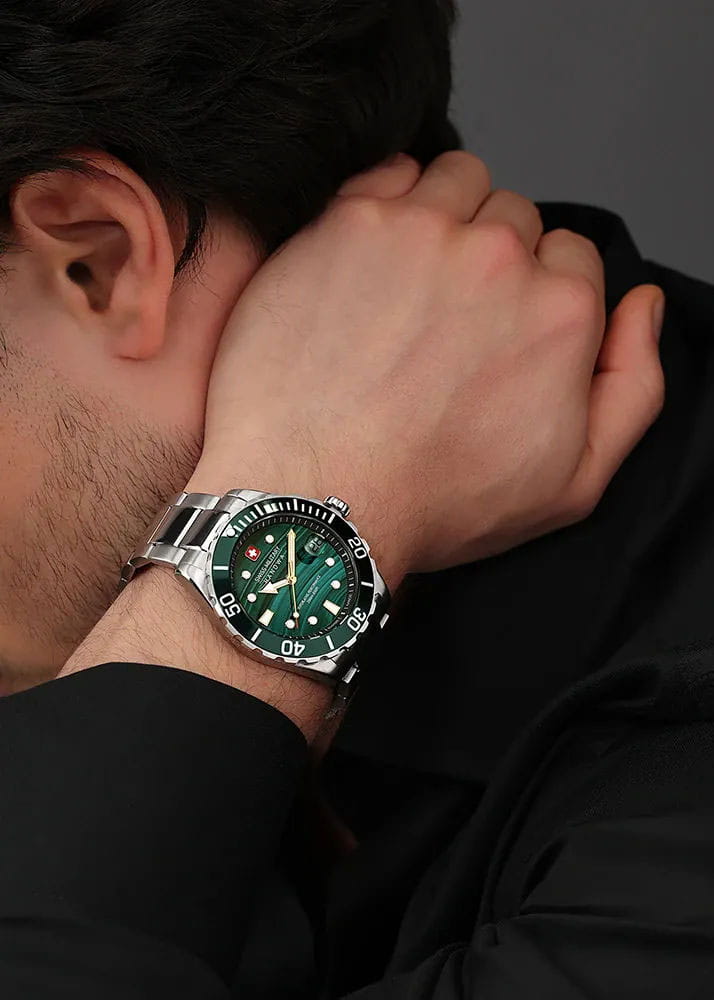 Swiss Military Hanowa Greyhound SMWGH0005804 — воплощение швейцарского качества и элегантного дизайна. Лимитированная серия — 444 экземпляра. Эти часы идеально подойдут для уверенного в себе мужчины, ценящего стиль и надежность. Корпус часов выполнен из нержавеющей стали, что придает им современный и мужественный вид. Диаметр корпуса составляет 44 мм, что делает их универсальным аксессуаром для любого случая. Циферблат из натурального малахита, метки и стрелки светятся в темноте благодаря люминесцентному покрытиюЛюминесцентное покрытиеПозволяет считывать показания времени в темноте. Производители наносят на стрелки, часовые индексы, безель или поверхность циферблата светонакопительный состав, дающий холодное свечение. обеспечивает отличную читаемость и подчеркивает строгий стиль модели. Сапфировое стеклоСапфировое стеклоПрочный и надёжный материал из кристалла сапфира синтетического происхождения, характеризующийся особой твёрдостью и устойчивостью к царапинам и повреждениям. защищает циферблат от царапин и повреждений, гарантируя долгий срок службы и сохранение первоначального внешнего вида часов. Часы оснащены надежным кварцевым механизмом, который обеспечивает высокую точность хода. Водозащита на уровне 200WR позволит плавать, нырять и заниматься другими водными видами спорта. Вращающийся в одном направлении рифленый безельБезельВнешний ободок, закрепляющий стекло. В спортивных часах так называется поворотное кольцо с делениями на циферблате, выполняет роль таймера – замеряет отрезки времени на шкале. Неподвижный безель – элемент декора. Однонаправленно вращающийся безель на дайверских часах позволяет фиксировать моменты погружения и выныривания на поверхность. с IP-покрытиемIP-покрытиеМетод ионного напыления. Демонстрирует повышенную устойчивость к истиранию, окислению и химическим веществам. Под воздействием высокого давления и температуры около 1500°C молекулы металла надёжно соединяются с частицами корпуса часов.. Стальной браслет на раскладной застёжкеРаскладная застёжкаТакой тип застёжки используется только на браслетах из металла. Она никогда не раскрывается полностью, происходит разделение на 2 и более частей. Раскладывающая застёжка снизит вероятность потери часов к минимуму. обеспечивает комфортное ношение на запястье.