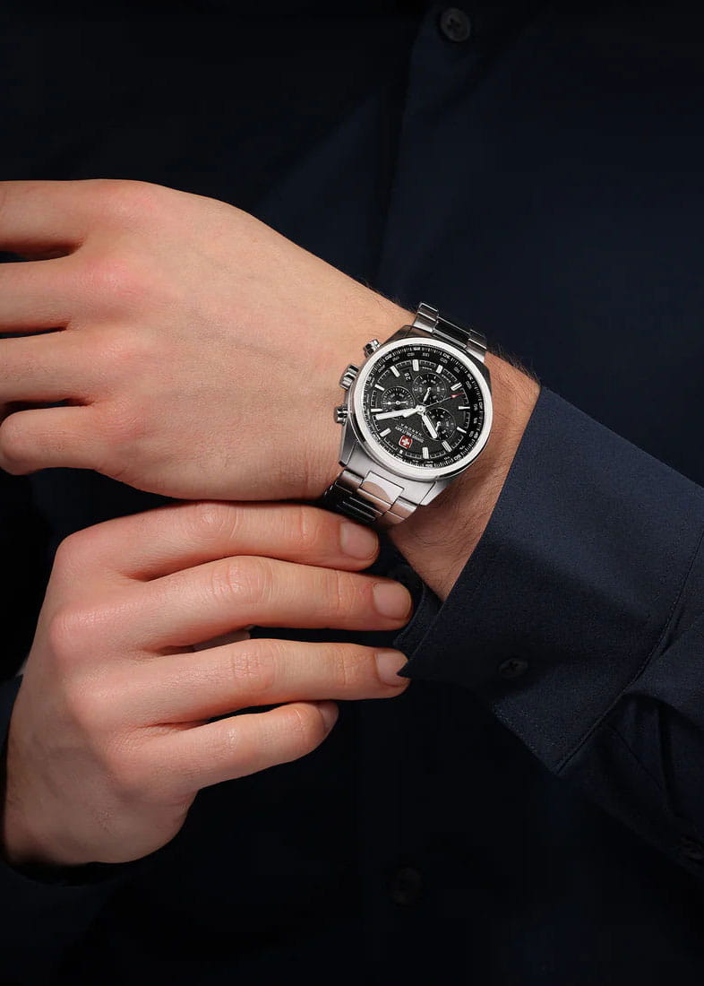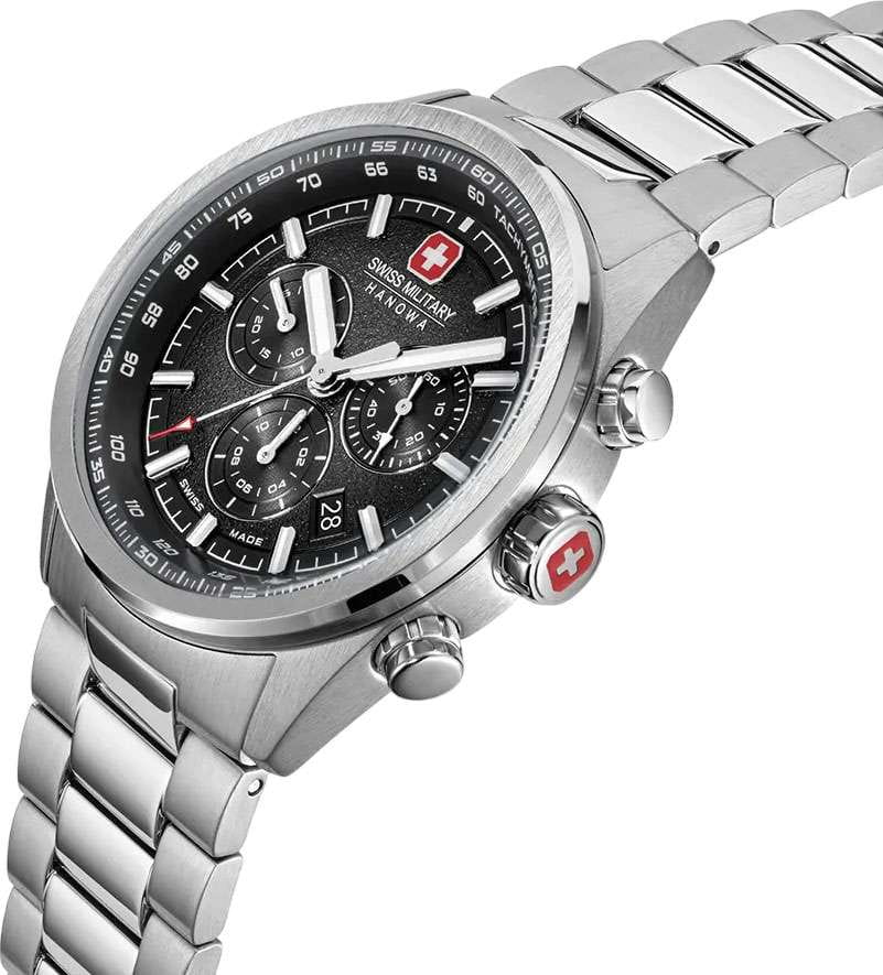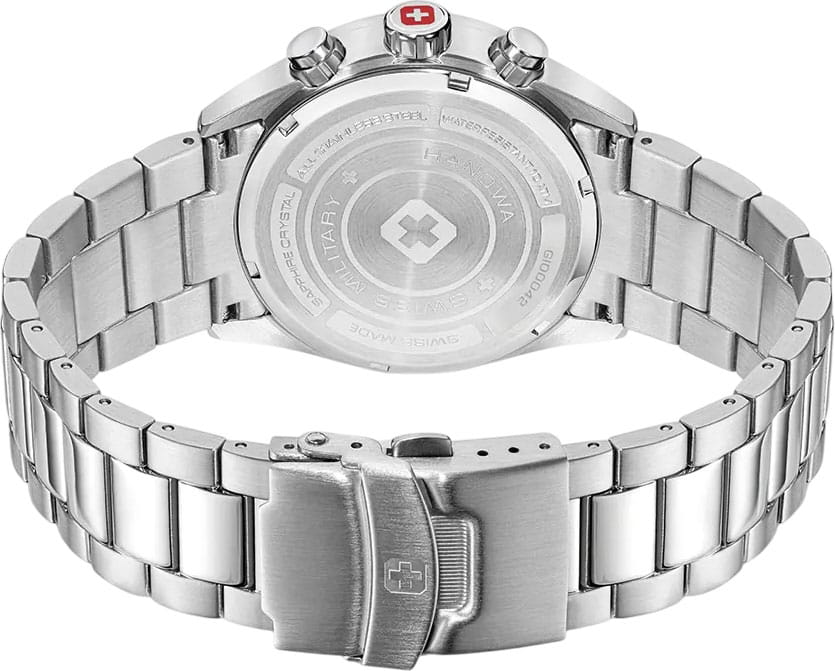 Мужские швейцарские часы Swiss Military Hanowa SMWGI0004204 – это элегантные часы, сочетающие в себе классический дизайн и современную функциональность. Корпус из нержавеющей стали диаметром 43 мм сбалансирован и элегантен. Сапфировое стеклоСапфировое стеклоПрочный и надёжный материал из кристалла сапфира синтетического происхождения, характеризующийся особой твёрдостью и устойчивостью к царапинам и повреждениям. с антибликовым покрытием защищает циферблат от царапин и обеспечивает отличную читаемость при любом освещении. Браслет с раскладной застёжкойРаскладная застёжкаТакой тип застёжки используется только на браслетах из металла. Она никогда не раскрывается полностью, происходит разделение на 2 и более частей. Раскладывающая застёжка снизит вероятность потери часов к минимуму. идеально дополняют дизайн часов, обеспечивая комфортное ношение. Люминесцентное покрытиеЛюминесцентное покрытиеПозволяет считывать показания времени в темноте. Производители наносят на стрелки, часовые индексы, безель или поверхность циферблата светонакопительный состав, дающий холодное свечение. стрелок и меток позволит вам следить за временем даже в полной темноте. Циферблат с точным механизмом хронографаХронографФункция позволяет измерять отрезки времени с особой точностью: часы, минуты, секунды. Верным признаком хронографа является наличие на циферблате 3 дополнительных окошек-счётчиков. и хорошо заметным индикатором даты в положении между 4 и 5 часов. ТахиметрТахиметрРазмеченная шкала, располагается на ободке или безеле часов. Тахиметр позволяет рассчитать скорость на определённом участке пути, расстояние измеряется в километрах или милях. по внешнему краю. Водонепроницаемость до 100 метров хорошо подходят для повседневного ношения и занятий водными видами спорта.