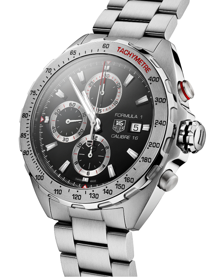 Профессиональный спортивный хронограф 44 мм с черным циферблатом, тремя вспомогательными циферблатами и стальным, вращающимся в одном направлении, безелем со шкалой тахиметра для преобразования расстояния в скорость. Метки на безеле, вдохновленные гонками, являются символом знаковой коллекции. TAG Heuer Formula 1 CAZ2010.BA0876, механический механизм (автоматический калибр) с высокой точностью. Сапфировое стекло устойчивое к появлению царапин, обладающее высокой прозрачностью. Класс водозащиты: 200 метров, позволит плавать, нырять и заниматься другими водными видами спорта. Корпус часов изготовлен из стали, серебристого цвета.