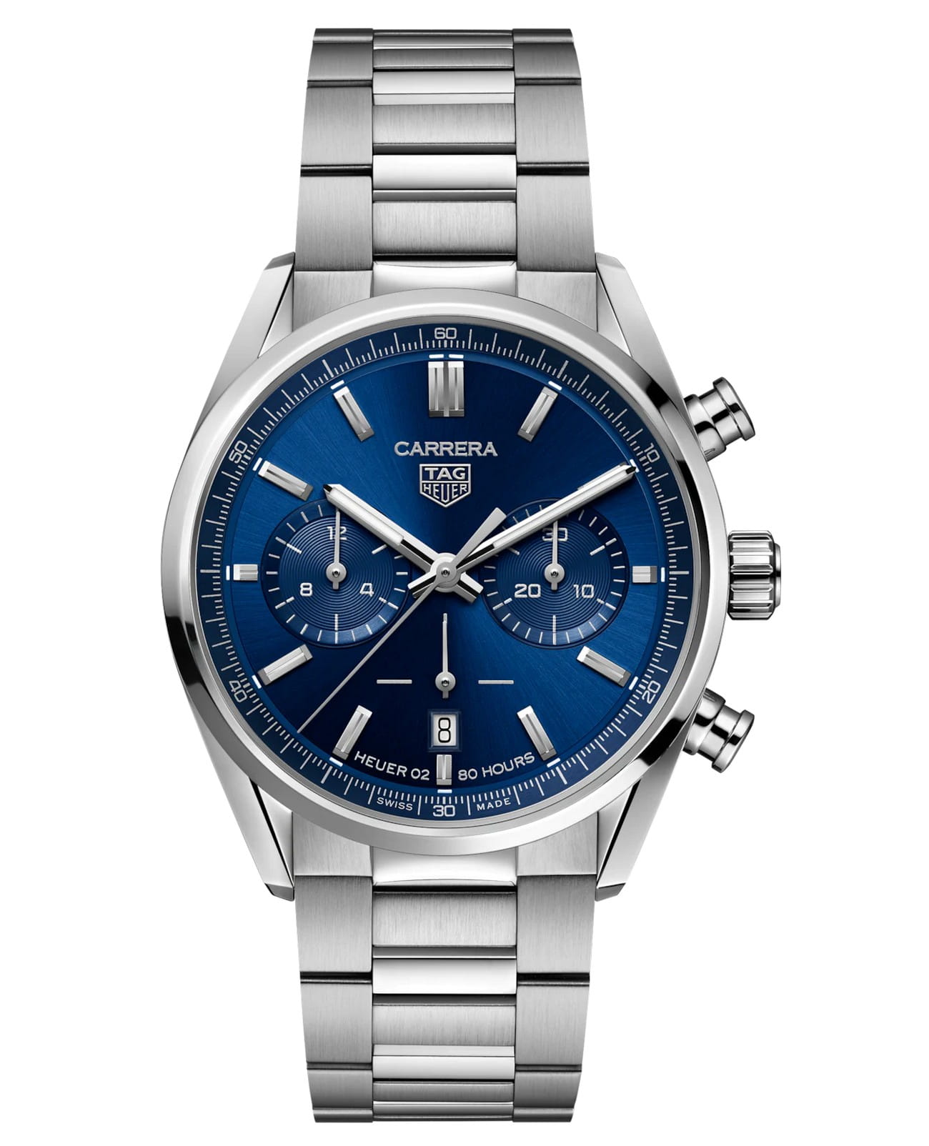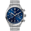 Впечатляющие часы в корпусе из полированной и матовой стали диаметром 42 мм привлекают внимание индексами и стрелками с родиевым покрытием и переливающимся темно-синим циферблатом. Модель TAG Heuer Carrera с уникальной часовой родословной сочетает в себе точный хронометраж и уверенный и элегантный стиль.