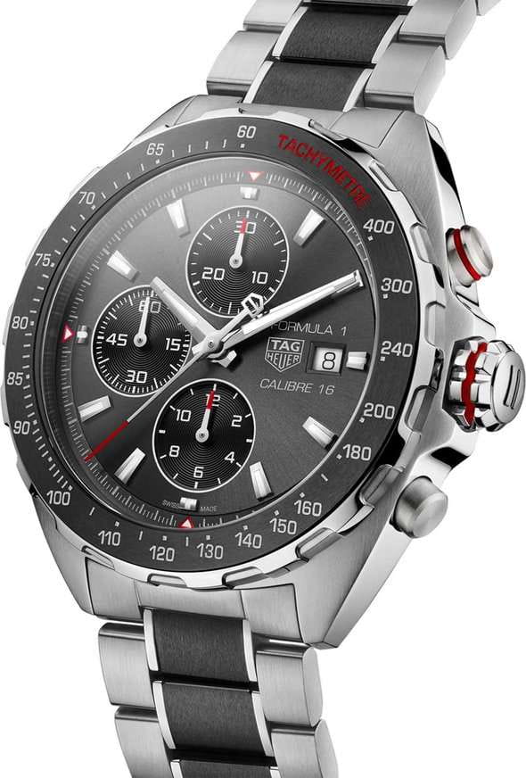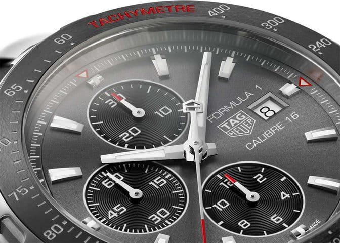 Мужские механические часы TAG Heuer Formula 1 Chronograph CAZ2012.BA0970 — это стильное сочетание элегантности и современного дизайна. Корпус из нержавеющей стали диаметром 44 мм идеально сбалансирован и элегантен. Сапфировое стеклоСапфировое стеклоПрочный и надёжный материал из кристалла сапфира синтетического происхождения, характеризующийся особой твёрдостью и устойчивостью к царапинам и повреждениям. с антибликовым покрытием защищает циферблат от царапин и обеспечивает отличную читаемость при любом освещении. Стальной браслет на раскладной застёжкеРаскладная застёжкаТакой тип застёжки используется только на браслетах из металла. Она никогда не раскрывается полностью, происходит разделение на 2 и более частей. Раскладывающая застёжка снизит вероятность потери часов к минимуму. идеально дополняют дизайн часов, обеспечивая комфортное ношение. Стрелки и метки на циферблате имеют люминесцентное покрытиеЛюминесцентное покрытиеПозволяет считывать показания времени в темноте. Производители наносят на стрелки, часовые индексы, безель или поверхность циферблата светонакопительный состав, дающий холодное свечение. позволяющее легко определять время даже в темноте. БезельБезельВнешний ободок, закрепляющий стекло. В спортивных часах так называется поворотное кольцо с делениями на циферблате, выполняет роль таймера – замеряет отрезки времени на шкале. Неподвижный безель – элемент декора. Однонаправленно вращающийся безель на дайверских часах позволяет фиксировать моменты погружения и выныривания на поверхность. тахиметраТахиметрРазмеченная шкала, располагается на ободке или безеле часов. Тахиметр позволяет рассчитать скорость на определённом участке пути, расстояние измеряется в километрах или милях. подчёркивает спортивное наследие часов. Часы обладают впечатляющей водонепроницаемостью до 20 бар (200 метров), что делает их идеальными для плавания, ныряния и погружений с аквалангом. Автоматический хронографХронографФункция позволяет измерять отрезки времени с особой точностью: часы, минуты, секунды. Верным признаком хронографа является наличие на циферблате 3 дополнительных окошек-счётчиков. обеспечивает точное измерение времени на каждом круге. Запас хода до 42 часов. Завинчивающаяся задняя крышка украшена специальным узором «клетка». Прочная конструкция часов и высокопроизводительный механизм делают их идеальным спутником для любителей гонок.