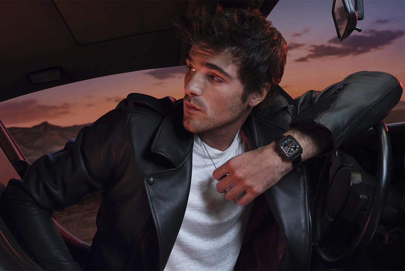 Мужские наручные часы-хронографХронографФункция позволяет измерять отрезки времени с особой точностью: часы, минуты, секунды. Верным признаком хронографа является наличие на циферблате 3 дополнительных окошек-счётчиков. TAG Heuer Monaco CBL2180.FC6497. Эта специальная серия TAG Heuer Monaco Special Edition, в невероятно элегантном 39-миллиметровом черном титановом корпусе с DLC-покрытиемDLC-покрытиеDiamond like carbon - одно из лучших видов покрытия, представляющее собой углерод с алмазными свойствами. На поверхность материала наносятся распавшиеся молекулы углерода, превращающиеся в плёнку из алмазоподобных связей, которая перенимает твёрдость алмаза.. Дерзкий и бунтарский, черный матовый циферблат контрастирует с покрытыми розовым золотом 5N стрелками и индексами, покрытыми ярко-белым люминесцентным покрытиемЛюминесцентное покрытиеПозволяет считывать показания времени в темноте. Производители наносят на стрелки, часовые индексы, безель или поверхность циферблата светонакопительный состав, дающий холодное свечение.. Циферблат защищает сапфировое стеклоСапфировое стеклоПрочный и надёжный материал из кристалла сапфира синтетического происхождения, характеризующийся особой твёрдостью и устойчивостью к царапинам и повреждениям. со скошенной кромкой. Через прозрачную заднюю крышку открывается вид на автоматический механизм со смелым покрытием ротора из розового золота 5N, гармонирующим с циферблатом. Часы оснащены дерзким черным ремешком из кожи аллигатора с раскладной застёжкойРаскладная застёжкаТакой тип застёжки используется только на браслетах из металла. Она никогда не раскрывается полностью, происходит разделение на 2 и более частей. Раскладывающая застёжка снизит вероятность потери часов к минимуму. из черного DLC-титана и двойными предохранительными кнопками.