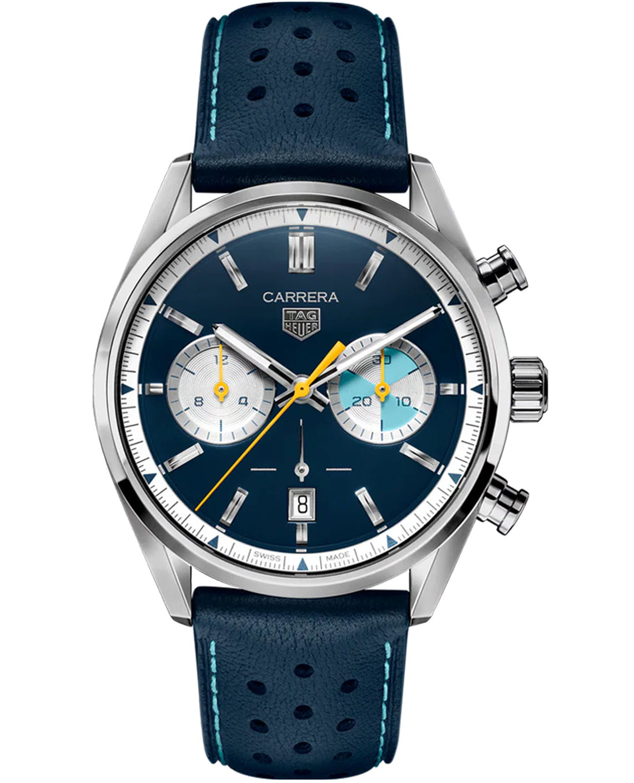 В великолепном исполнении эти часы-хронографХронографФункция позволяет измерять отрезки времени с особой точностью: часы, минуты, секунды. Верным признаком хронографа является наличие на циферблате 3 дополнительных окошек-счётчиков. TAG Heuer Carrera Chronograph CBN201N.FC6620 вдохновлены легендарной моделью Heuer 1950-х и 1960-х годов. Ограниченная серия с 500 экземплярами, каждый эксклюзивный экземпляр пронумерован. Циферблат синего цвета, дополненный бирюзовыми акцентами и яркими желтыми бликами, создает изысканный и уникальный вид. Часы оснащены мануфактурным механизмом TAG Heuer TH20-00. Механический механизм (автоматический калибр) с высокой точностью. Сапфировое стеклоСапфировое стеклоПрочный и надёжный материал из кристалла сапфира синтетического происхождения, характеризующийся особой твёрдостью и устойчивостью к царапинам и повреждениям. устойчивое к появлению царапин, обладающее высокой прозрачностью. Стрелки с люминесцентным покрытиемЛюминесцентное покрытиеПозволяет считывать показания времени в темноте. Производители наносят на стрелки, часовые индексы, безель или поверхность циферблата светонакопительный состав, дающий холодное свечение.. Класс водозащиты: 100 метров, позволит плавать, нырять и заниматься другими водными видами спорта. Корпус часов изготовлен из нержавеющей стали. Кожаный ремешок с раскладной застёжкойРаскладная застёжкаТакой тип застёжки используется только на браслетах из металла. Она никогда не раскрывается полностью, происходит разделение на 2 и более частей. Раскладывающая застёжка снизит вероятность потери часов к минимуму..