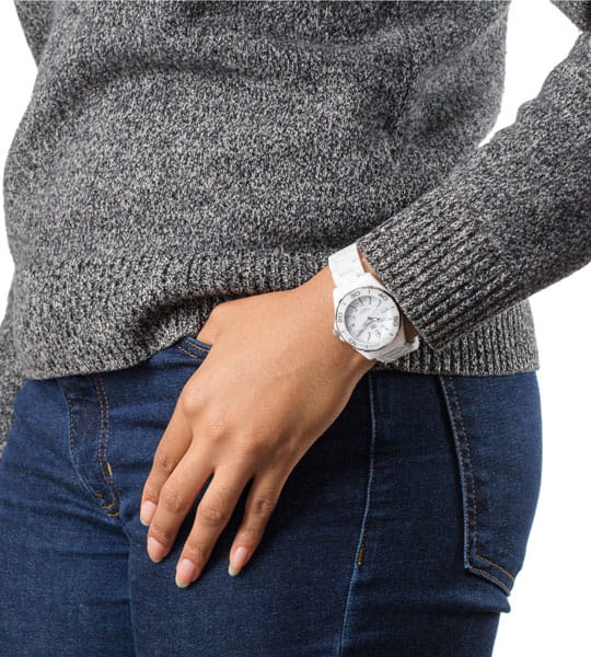 TAG Heuer Aquaracer WAY1391.BH0717 — элегантные женские часы, сочетающие стиль и функциональность. Корпус диаметром 35 мм выполнен из стали с белой матовой керамикой, обеспечивающей лёгкость и устойчивость к царапинам. Белый циферблат оснащён накладными часовыми метками и стрелками с люминесцентным покрытиемЛюминесцентное покрытиеПозволяет считывать показания времени в темноте. Производители наносят на стрелки, часовые индексы, безель или поверхность циферблата светонакопительный состав, дающий холодное свечение., обеспечивающим отличную читаемость в любых условиях освещения. Часы оснащены точным кварцевым механизмом, обеспечивающим стабильное отображение времени. Функциональность включает индикацию часов, минут, секунд и даты, расположенной на отметке «3 часа». БезельБезельВнешний ободок, закрепляющий стекло. В спортивных часах так называется поворотное кольцо с делениями на циферблате, выполняет роль таймера – замеряет отрезки времени на шкале. Неподвижный безель – элемент декора. Однонаправленно вращающийся безель на дайверских часах позволяет фиксировать моменты погружения и выныривания на поверхность. однонаправленный вращающийся, выполнен из стали и керамики и является устойчивыми к царапинам. Водозащита до 300 метров (30 бар) делает модель подходящей для дайвинга и активного образа жизни. Браслет из белой матовой керамики оснащён раскладной застёжкойРаскладная застёжкаТакой тип застёжки используется только на браслетах из металла. Она никогда не раскрывается полностью, происходит разделение на 2 и более частей. Раскладывающая застёжка снизит вероятность потери часов к минимуму. из нержавеющей стали с кнопками для дополнительной безопасности.