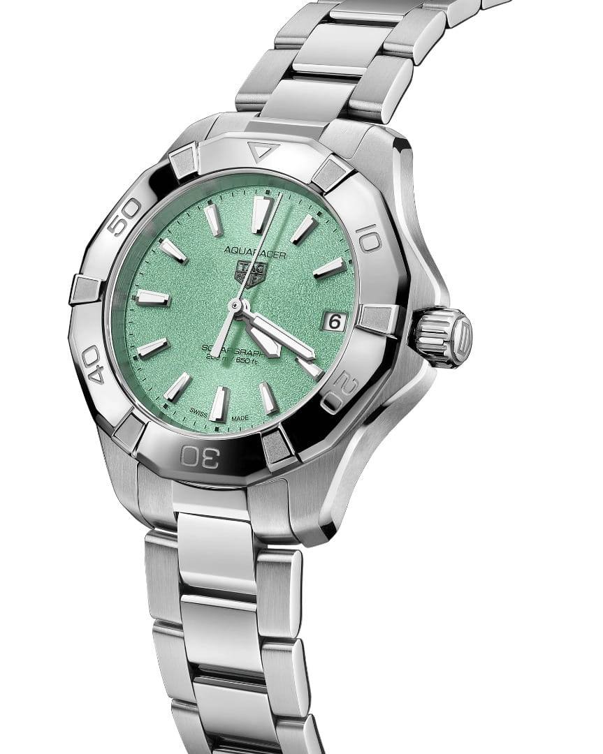 Женские швейцарские наручные кварцевые часы на солнечной батарейке TAG Heuer Aquaracer Professional Solargraph WBP1312.BA0005. Сапфировое стеклоСапфировое стеклоПрочный и надёжный материал из кристалла сапфира синтетического происхождения, характеризующийся особой твёрдостью и устойчивостью к царапинам и повреждениям. устойчивое к появлению царапин, обладающее высокой прозрачностью. Стрелки и метки с люминесцентным покрытиемЛюминесцентное покрытиеПозволяет считывать показания времени в темноте. Производители наносят на стрелки, часовые индексы, безель или поверхность циферблата светонакопительный состав, дающий холодное свечение. Super-LumiNova. Класс водозащиты: 200 метров, позволит плавать, нырять и заниматься другими водными видами спорта. Корпус часов изготовлен из нержавеющей стали. Браслет с раскладной застёжкойРаскладная застёжкаТакой тип застёжки используется только на браслетах из металла. Она никогда не раскрывается полностью, происходит разделение на 2 и более частей. Раскладывающая застёжка снизит вероятность потери часов к минимуму.. Вращающийся стальной безельБезельВнешний ободок, закрепляющий стекло. В спортивных часах так называется поворотное кольцо с делениями на циферблате, выполняет роль таймера – замеряет отрезки времени на шкале. Неподвижный безель – элемент декора. Однонаправленно вращающийся безель на дайверских часах позволяет фиксировать моменты погружения и выныривания на поверхность.. Окошко даты находится в положении 3 часа.