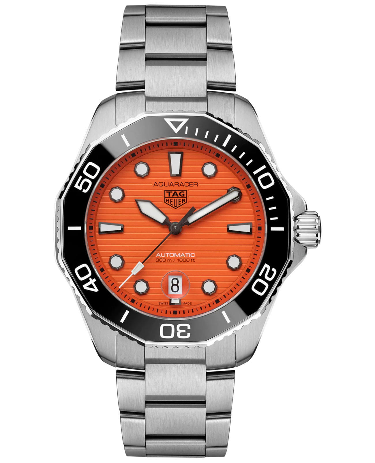 Дизайн часов TAG Heuer Aquaracer вдохновлен классической моделью 1979 года. Эти дерзкие оранжевые часы для дайвинга в стальном 43-миллиметровом корпусе готовы выдержать любые условия. Идеальный спутник для ваших свершений, полных адреналина. Мужские механические швейцарские часы с автоподзаводом TAG Heuer Aquaracer Professional 300 Orange Diver WBP201F.BA0632, механический механизм (автоматический калибр) с высокой точностью. Сапфировое стеклоСапфировое стеклоПрочный и надёжный материал из кристалла сапфира синтетического происхождения, характеризующийся особой твёрдостью и устойчивостью к царапинам и повреждениям. устойчивое к появлению царапин, обладающее высокой прозрачностью. Класс водозащиты: 300 метров, позволит плавать, нырять и заниматься другими водными видами спорта. Корпус часов изготовлен из стали. Функциональный и элегантный корпус часов TAG Heuer Aquaracer отличается высокой эргономичностью и готов к любым испытаниям. Стальной браслет на раскладной застёжкеРаскладная застёжкаТакой тип застёжки используется только на браслетах из металла. Она никогда не раскрывается полностью, происходит разделение на 2 и более частей. Раскладывающая застёжка снизит вероятность потери часов к минимуму. с точной системой регулировки и высококачественной надежной застежкой прослужит долгие годы. Оранжевый – цвет безопасности в море, а яркие тона обеспечивают максимальный контраст с голубизной воды. Циферблат, созданный, чтобы выделяться. Вращающийся в одном направлении керамический безельБезельВнешний ободок, закрепляющий стекло. В спортивных часах так называется поворотное кольцо с делениями на циферблате, выполняет роль таймера – замеряет отрезки времени на шкале. Неподвижный безель – элемент декора. Однонаправленно вращающийся безель на дайверских часах позволяет фиксировать моменты погружения и выныривания на поверхность..