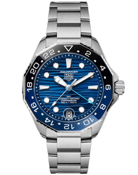 TAG Heuer Aquaracer созданные для погружения и серфинга по всему миру благодаря своей экстремальной технической конструкции и калибру GMT. Благодаря свежему и спортивному стилю он станет отличным аксессуаром. Прочный 42-миллиметровый корпус с водонепроницаемостью 300 м и прочным сине-белым керамическим безелем выдержит любые условия. Благодаря автоматическому калибру 7 GMT, которым оснащены часы TAG Heuer Aquaracer, отслеживание времени по всему миру никогда не было таким простым.Часы оснащены желтой стрелкой GMT, которая делает один полный оборот в день, следуя 24-часовой шкале, видимой на двунаправленном безеле GMT, что позволяет вам определять второй часовой пояс на вашем запястье. Безель представлен в двух цветах, чтобы отличать день от ночи: половина темно-синего цвета, чтобы соответствовать циферблату и представлять ночные часы с 6 вечера до 6 утра; и половина ярко-белого цвета, чтобы обозначить дневные часы с 6 утра до 6 вечера. Механический механизм с автоподзаводом. Сапфировое стеклоСапфировое стеклоПрочный и надёжный материал из кристалла сапфира синтетического происхождения, характеризующийся особой твёрдостью и устойчивостью к царапинам и повреждениям. устойчивое к появлению царапин, обладающее высокой прозрачностью. Стрелки с люминесцентным покрытиемЛюминесцентное покрытиеПозволяет считывать показания времени в темноте. Производители наносят на стрелки, часовые индексы, безель или поверхность циферблата светонакопительный состав, дающий холодное свечение.. Вращающийся безельБезельВнешний ободок, закрепляющий стекло. В спортивных часах так называется поворотное кольцо с делениями на циферблате, выполняет роль таймера – замеряет отрезки времени на шкале. Неподвижный безель – элемент декора. Однонаправленно вращающийся безель на дайверских часах позволяет фиксировать моменты погружения и выныривания на поверхность. из керамики. Класс водозащиты: 300 метров, позволит плавать, нырять и заниматься другими водными видами спорта. Корпус часов изготовлен из стали. Браслет с раскладной застёжкойРаскладная застёжкаТакой тип застёжки используется только на браслетах из металла. Она никогда не раскрывается полностью, происходит разделение на 2 и более частей. Раскладывающая застёжка снизит вероятность потери часов к минимуму..