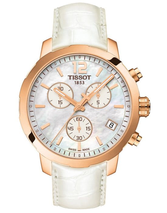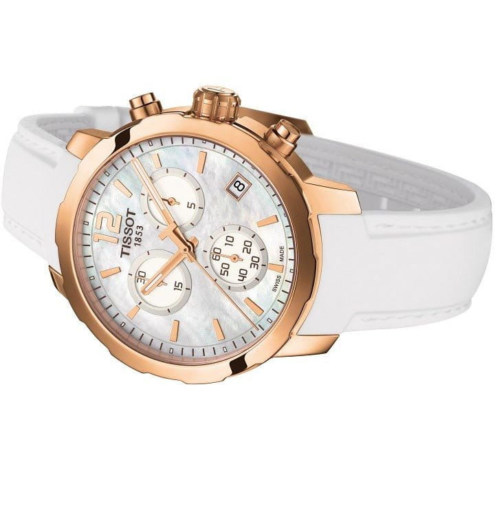 TISSOT T0954173611700 T-Sport Quickster Quartz Chronograph - женские кварцевые наручные часы Корпус этих часов среднего размера (42 мм) и выполнен из нержавеющей стали L316 с PVD-покрытием цвета розового золота Модель TISSOT T0954173611700 T-Sport Quickster Quartz Chronograph имеет устойчивое к царапинам сапфировое стекло, ремешок из натуральной кожи белого цвета, белый циферблат Калибр механизма: ETA G10211 Класс водозащиты: 100 м / 10 АТМ (разрешается плавание и ныряние без акваланга) Дополнительные функции и особенности: отображение числа, хронограф (секундомер), тахиметр Полная заводская комплектация TISSOT: оригинальные часы, фирменная коробка, инструкция, сервисная книжка, роман о часовой фабрике, миникаталог, замшевый фирменный чехол черного цвета для хранения и/или переноски часов, кассовый и товарный чеки Международная гарантия 2 года Производство и сборка: Швейцария