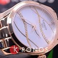 Минималистичный перламутровый циферблат с узором инкрустирован бриллиантами, имеющими законное происхождение. На светлом фоне идеально смотрятся тонкие стрелки в виде лепестков. Часы имеют PVD-покрытиеPVDУльтратонкое покрытие наносится в технике вакуумного напыления, сочетает в себе нитрид титана особой прочности со слоем золота или оксида хрома. Несёт в себе декоративную или защитную функцию. цвета розового золота. Внутри корпуса находится кварцевый механизм ETA F04.111 с высокой точностью хода. Сапфировое стекло. . Функция EOLEOLПредставляет собой систему, уведомляющую владельца часов о необходимости замены элемента питания. За 2 недели до полного разряда батарейки секундная стрелка перестаёт ходить чётко и начинает перепрыгивать на 3-4 деления.. Габариты: 30 x 30 x 8,7 мм.