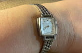 Дизайнеры привнесли оригинальности в оформлении всего: нетипичный корпус-квадрат, привлекательный узор на циферблате, необычный стальной браслет, состоящий из множества мельчайших звеньев. Застёжка «бабочка» с кнопкамиЗастёжка "бабочка"Такой вид застёжки дополняется предохранителями, помогающими избежать случайного раскрытия браслета. Обладают изящным исполнением. . Циферблат инкрустирован 12 бриллиантами - 0.0252 карат, расположенными на месте цифр. Швейцарский кварцевый калибр ETA 901.001 с высокой точностью хода. Стекло из сапфираСапфировое стеклоПрочный и надёжный материал из кристалла сапфира синтетического происхождения, характеризующийся особой твёрдостью и устойчивостью к царапинам и повреждениям. устойчиво к появлению царапин. Водонепроницаемость до 3 бар. Габариты: 20 x 20 x 7,1 мм.