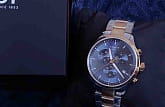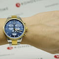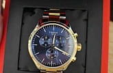 Мужской хронографХронографФункция позволяет измерять отрезки времени с особой точностью: часы, минуты, секунды. Верным признаком хронографа является наличие на циферблате 3 дополнительных окошек-счётчиков. не только позволяет измерять временные промежутки с особой точностью, но и выполняет роль элегантного аксессуара. Ярко-синий циферблат сразу бросается в глаза, три дополнительных счётчика привносят в общий облик модели спортивный стиль. Наручные часы изготовлены из нержавеющей стали с PVD-покрытиемPVDУльтратонкое покрытие наносится в технике вакуумного напыления, сочетает в себе нитрид титана особой прочности со слоем золота или оксида хрома. Несёт в себе декоративную или защитную функцию., тяжесть материала приятно ощущается на запястье и не доставляет неудобств. Кварцевый механизм ETA G10.212. Люминесцентная подсветка. Высокие показатели водозащиты. Габариты: 45 x 45 x 11 мм. Производство и сборка: Швейцария.