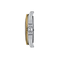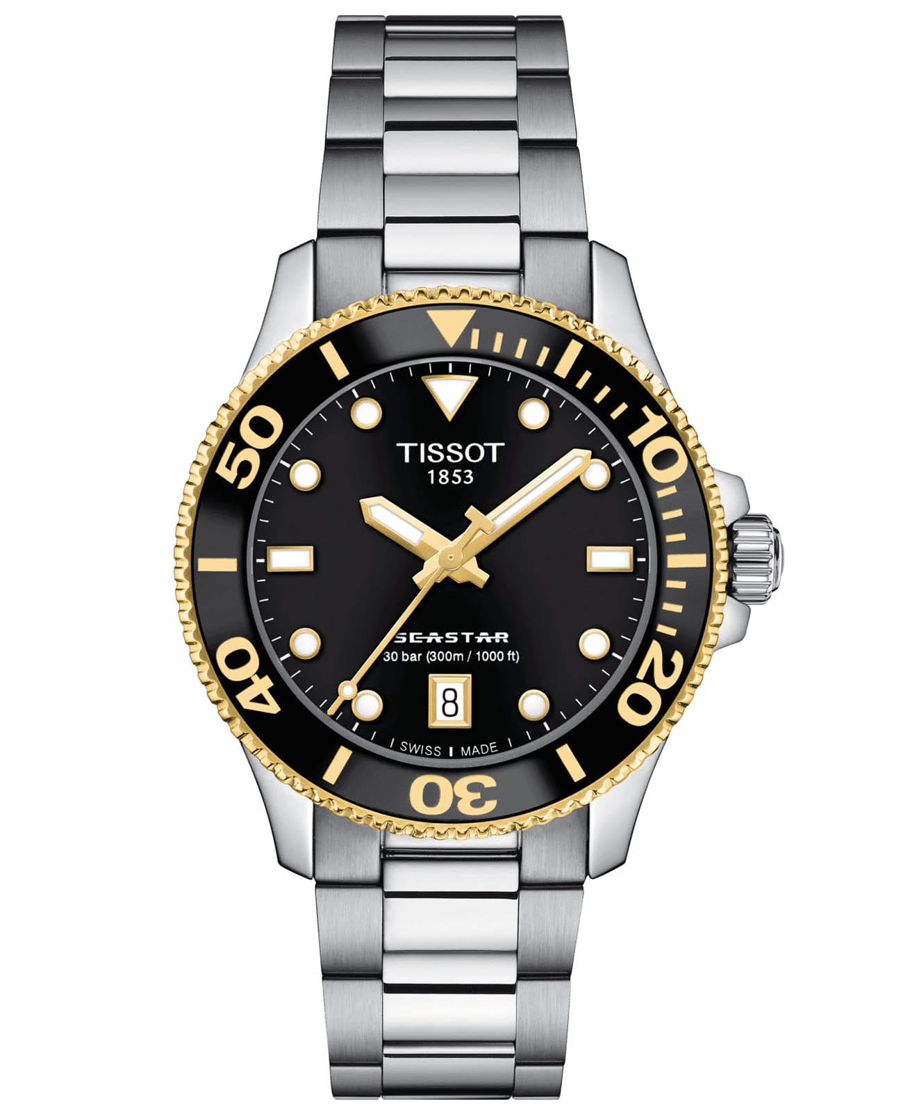 Модель T120.210.21.051.00 — женский швейцарский дайвер с корпусом 36 мм из 316L нержавеющей стали с золотистым PVD-покрытиемPVDУльтратонкое покрытие наносится в технике вакуумного напыления, сочетает в себе нитрид титана особой прочности со слоем золота или оксида хрома. Несёт в себе декоративную или защитную функцию. и браслетом из того же материала. Надёжный швейцарский кварцевый механизм гарантирует точность, а водонепроницаемость до 30 bar (300 м) позволяет погружаться без опасений. Чёрный циферблат защищён сапфировым стекломСапфировое стеклоПрочный и надёжный материал из кристалла сапфира синтетического происхождения, характеризующийся особой твёрдостью и устойчивостью к царапинам и повреждениям. с антибликовым покрытиемАнтибликовое покрытиеСлой оксида металла в 0,13-0,3 микрон, благодаря которому стекло часов не бликует и не отражает свет. Антибликовое покрытие уменьшает отражение света в 10 раз, обеспечивая отличную читаемость показателей циферблата.. Удобная раскладная застёжкаРаскладная застёжкаТакой тип застёжки используется только на браслетах из металла. Она никогда не раскрывается полностью, происходит разделение на 2 и более частей. Раскладывающая застёжка снизит вероятность потери часов к минимуму. и uni-directional вращающийся безель подчёркивают профессиональный характер модели.