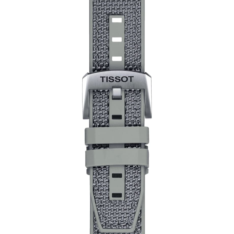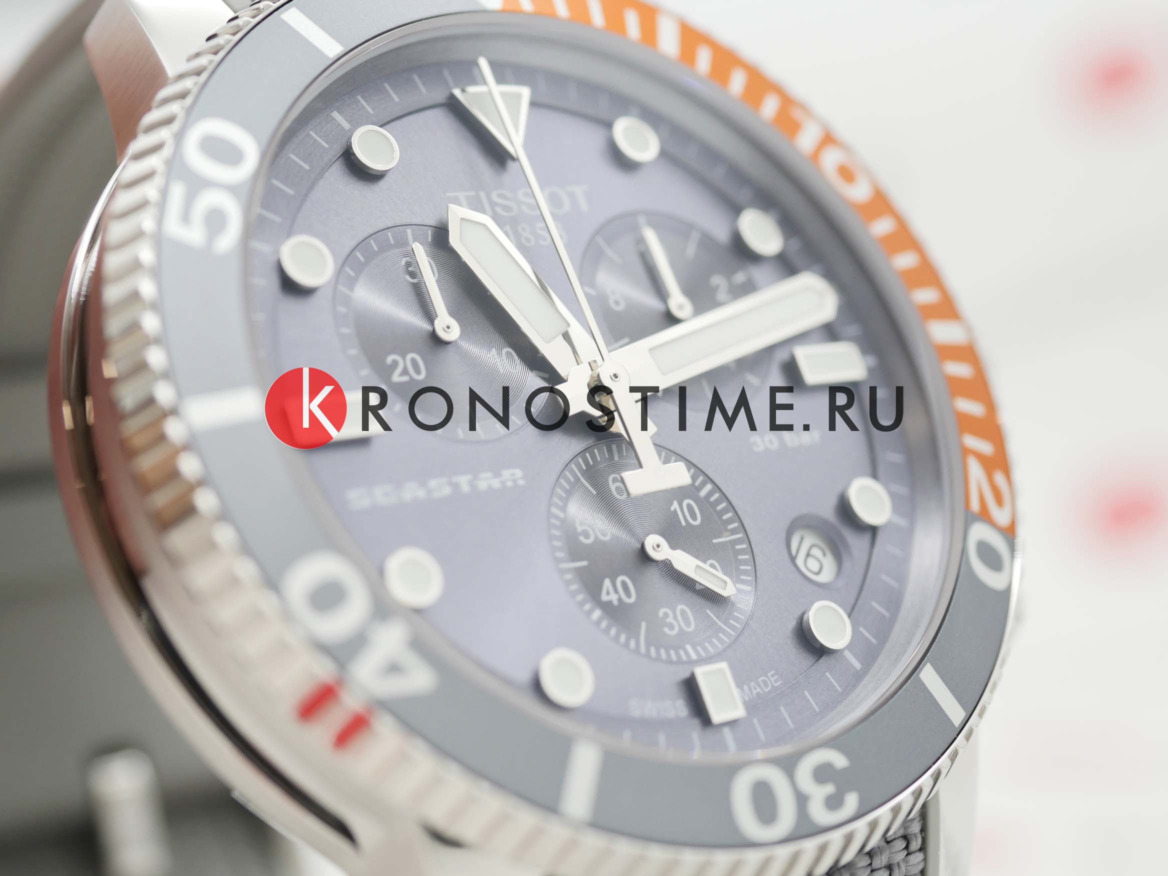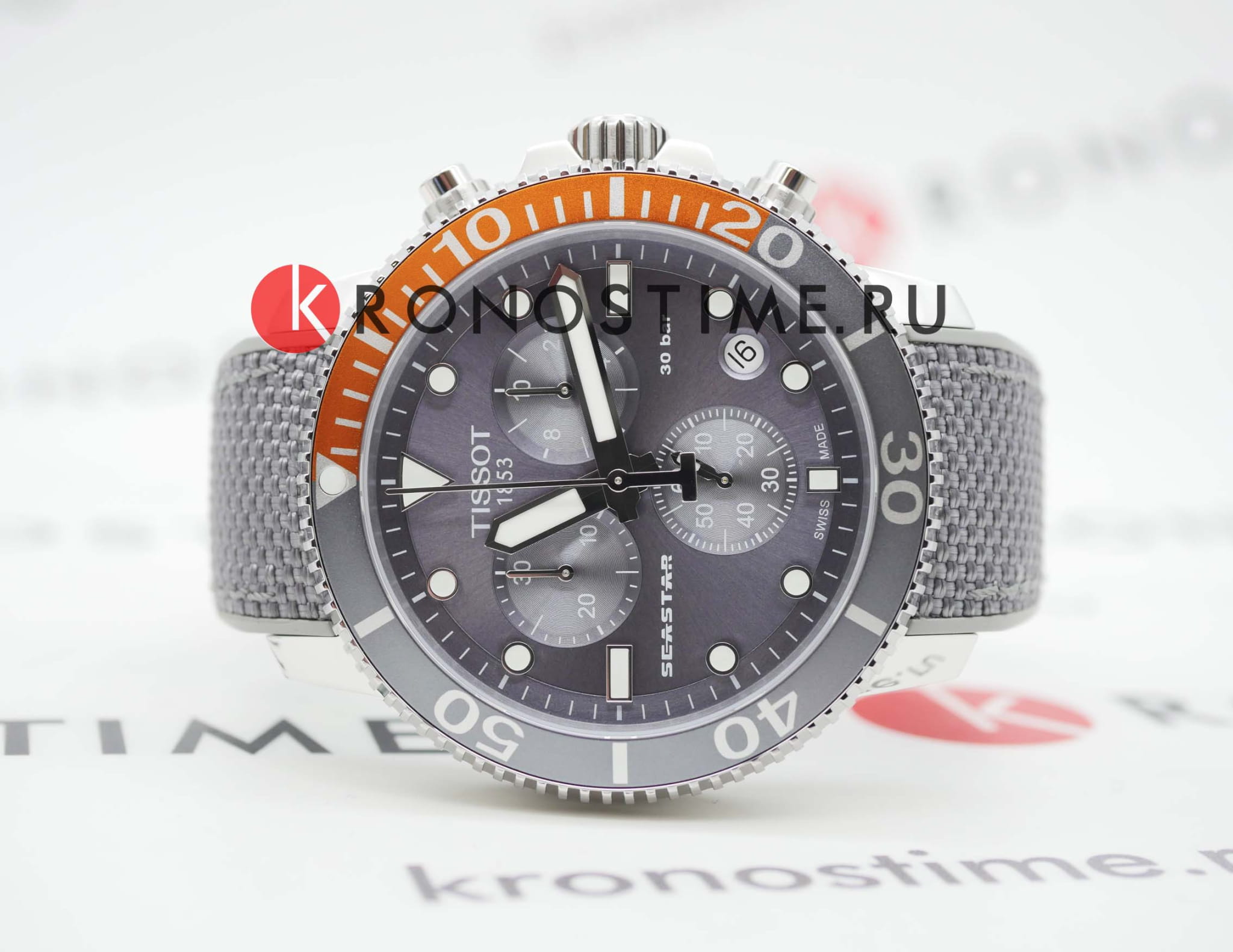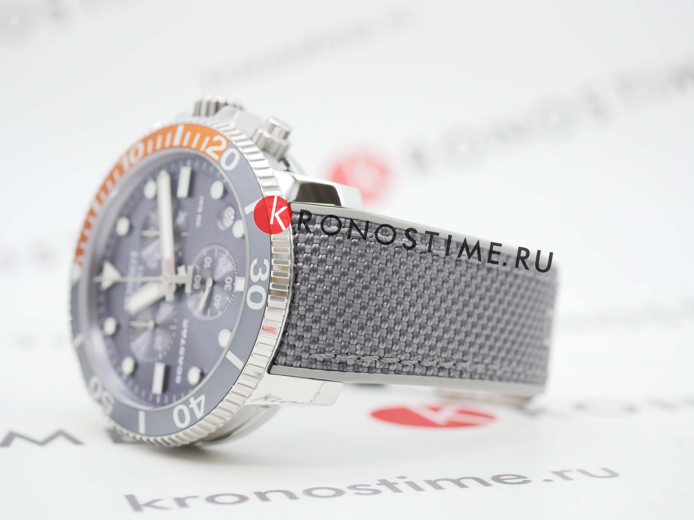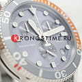 Наручные часы отличаются спортивным дизайном, прослеживается дайверская тематика, чему способствует и водонепроницаемость при давлении 30 бар на глубине 300 метров. Кварцевый механизм ETA G10.212. Керамический безельБезельВнешний ободок, закрепляющий стекло. В спортивных часах так называется поворотное кольцо с делениями на циферблате, выполняет роль таймера – замеряет отрезки времени на шкале. Неподвижный безель – элемент декора. Однонаправленно вращающийся безель на дайверских часах позволяет фиксировать моменты погружения и выныривания на поверхность. Сапфировое стекло с антибликовым покрытием. Завинчивающаяся заводная головка и задняя крышка. Люминесцентная подсветкаЛюминесцентное покрытиеПозволяет считывать показания времени в темноте. Производители наносят на стрелки, часовые индексы, безель или поверхность циферблата светонакопительный состав, дающий холодное свечение.. Серый тканевый ремешок. Секундомер, хронографХронографФункция позволяет измерять отрезки времени с особой точностью: часы, минуты, секунды. Верным признаком хронографа является наличие на циферблате 3 дополнительных окошек-счётчиков., календарь. Габариты: 45 x 45 x 12,8 мм.