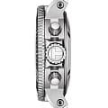 Градиентный синий циферблат имеет метки и стрелки, дополненные люминесцентным покрытиемЛюминесцентное покрытиеПозволяет считывать показания времени в темноте. Производители наносят на стрелки, часовые индексы, безель или поверхность циферблата светонакопительный состав, дающий холодное свечение.. Поворотный керамический безельБезельВнешний ободок, закрепляющий стекло. В спортивных часах так называется поворотное кольцо с делениями на циферблате, выполняет роль таймера – замеряет отрезки времени на шкале. Неподвижный безель – элемент декора. Однонаправленно вращающийся безель на дайверских часах позволяет фиксировать моменты погружения и выныривания на поверхность. защищён от царапин. Модель отличается повышенной водостойкостью в 30 бар. Заводная головка около позиции 10 часов имеет гелиевый клапан для отвода газа – запатентованное изобретение Tissot. Часы комплектуются швейцарским высококлассным и надежным механизмом хронографом с автоподзаводом и изысканным декором ETA Valjoux A05.H21ValjouxПремиальный калибр от швейцарской компании ETA c уникальной отделкой механизма. Отличается увеличенным запасом хода от 45 до 60 часов, в зависимости от калибра, точность хода составляет +/- 5 секунд в сутки. с запасом хода на 60 часов. Функции: хронографХронографФункция позволяет измерять отрезки времени с особой точностью: часы, минуты, секунды. Верным признаком хронографа является наличие на циферблате 3 дополнительных окошек-счётчиков., секундомер, календарь. Модель поставляется в оригинальном кейсе с дополнительным каучуковым ремешком.