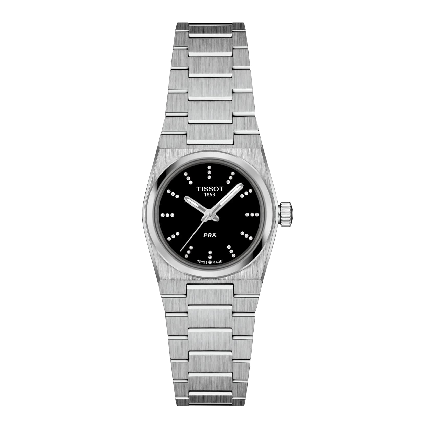 Модель Tissot PRX 25mm (артикул T1370101105600) воплощает элегантность и точность швейцарского часового мастерства. Корпус диаметром 25 мм выполнен из высококачественной нержавеющей стали 316L, обеспечивая прочность и долговечность. Черный циферблат украшен 36 бриллиантовыми маркерами (0,04 карата, чистота VS-SI, цвет Top Wesselton), придающими часам изысканный стиль. Сапфировое стеклоСапфировое стеклоПрочный и надёжный материал из кристалла сапфира синтетического происхождения, характеризующийся особой твёрдостью и устойчивостью к царапинам и повреждениям. с антибликовым покрытием защищает дисплей от царапин и обеспечивает отличную читаемость. Часы оснащены швейцарским кварцевым механизмом с функцией индикатора окончания заряда батареи (EOL)EOLПредставляет собой систему, уведомляющую владельца часов о необходимости замены элемента питания. За 2 недели до полного разряда батарейки секундная стрелка перестаёт ходить чётко и начинает перепрыгивать на 3-4 деления., который своевременно уведомляет о необходимости замены элемента питания. Водонепроницаемость до 100 метров делает модель подходящей для плавания и активного образа жизни. Браслет из нержавеющей стали с бабочковой застёжкойЗастёжка "бабочка"Такой вид застёжки дополняется предохранителями, помогающими избежать случайного раскрытия браслета. Обладают изящным исполнением. и кнопками обеспечивает надежную фиксацию и комфорт при ношении. Tissot PRX 25mm — это сочетание классического дизайна, блеска драгоценных камней и современных технологий, созданное для стильных и уверенных в себе женщин.