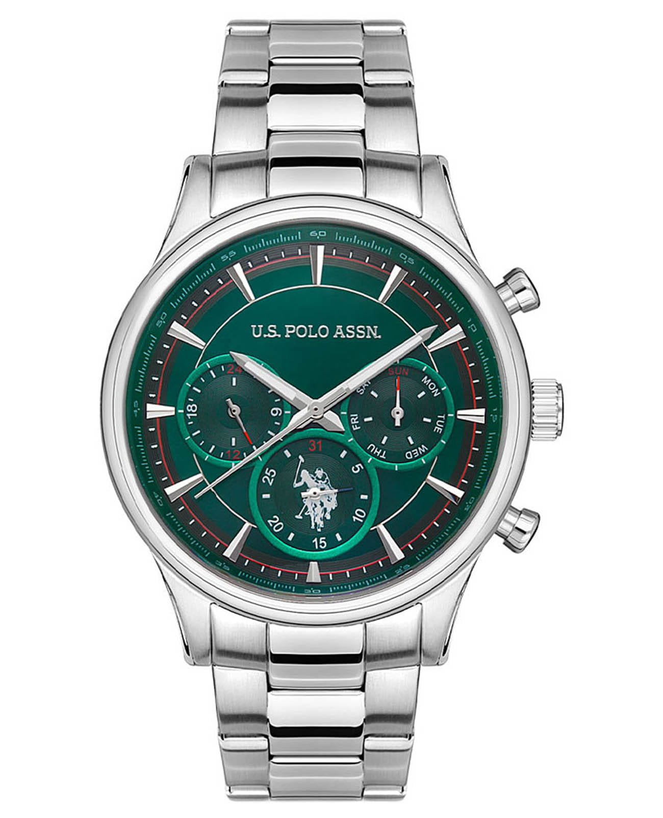 Мужские часы часы-хронографХронографФункция позволяет измерять отрезки времени с особой точностью: часы, минуты, секунды. Верным признаком хронографа является наличие на циферблате 3 дополнительных окошек-счётчиков. U.S. Polo Assn. Crossing USPA1010-10, кварцевый механизм с высокой точностью. Минеральное стеклоМинеральное стеклоМинеральное стекло представляет собой искусственно выращенный минерал кварца. Такое стекло отличается особой устойчивостью к повреждениям и царапинам. Уступает по некоторым качествам сапфировому стеклу. устойчивое к появлению царапин, обладающее высокой прозрачностью. Центральные часовая, минутная и секундная стрелки. Индикация даты и дня недели. 12/24х часовой формат времени. Корпус и браслет изготовлены из нержавеющей стали. На циферблате три дополнительных индикатора. Стрелки и метки с люминесцентным покрытиемЛюминесцентное покрытиеПозволяет считывать показания времени в темноте. Производители наносят на стрелки, часовые индексы, безель или поверхность циферблата светонакопительный состав, дающий холодное свечение.. Класс водозащиты: 50 метров, позволит защитить корпус от случайных брызг или капель дождя. Стальной браслет на застёжке «бабочка» с кнопкамиЗастёжка "бабочка"Такой вид застёжки дополняется предохранителями, помогающими избежать случайного раскрытия браслета. Обладают изящным исполнением. .