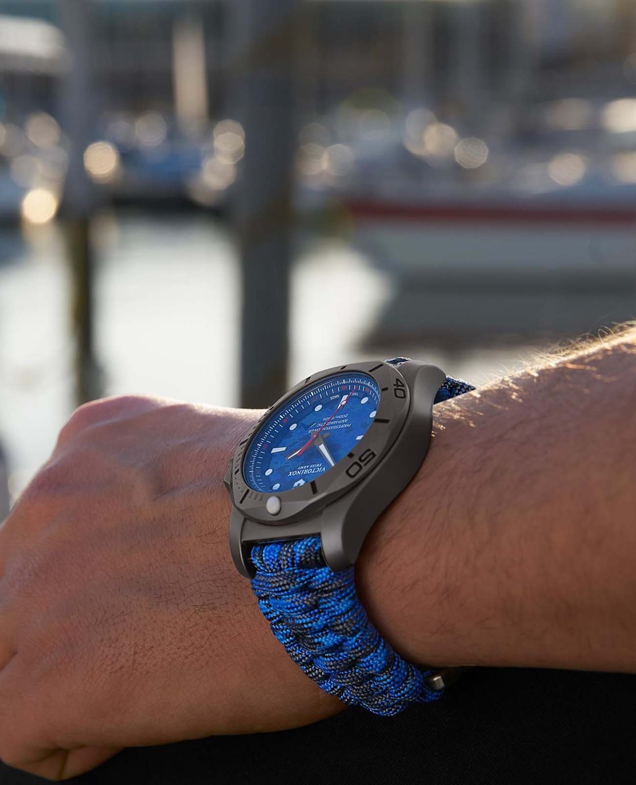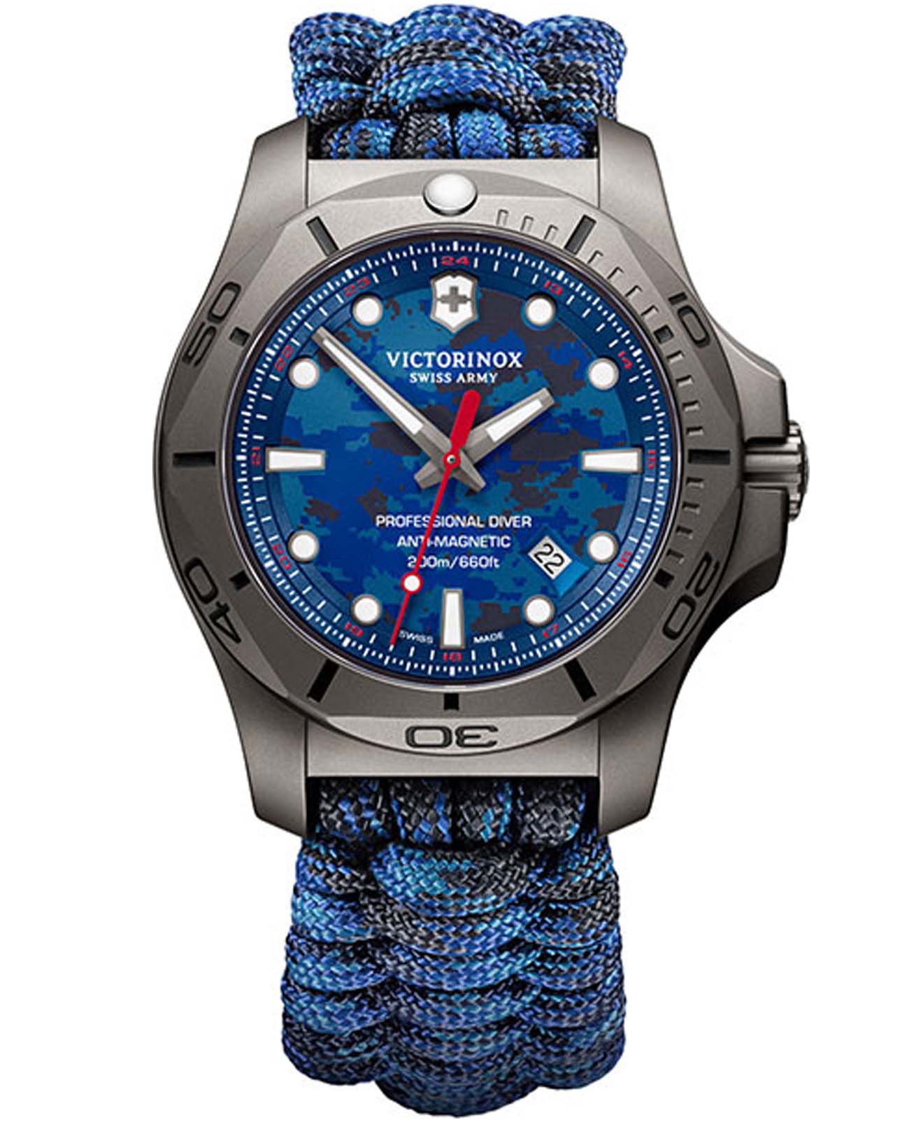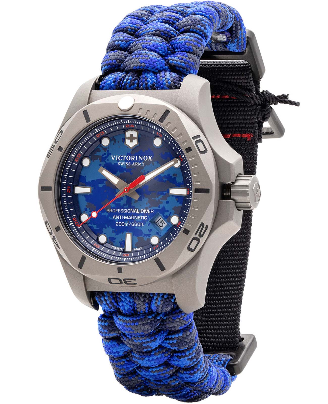 Мужские швейцарские часы Victorinox I.N.O.X. 241813. Сапфировое стеклоСапфировое стеклоПрочный и надёжный материал из кристалла сапфира синтетического происхождения, характеризующийся особой твёрдостью и устойчивостью к царапинам и повреждениям. с трёхслойным антибликовым покрытием. Корпус часов выполнен из нержавеющей стали 316L. Ремешок изготовлен из плетенной паракордовой стропы, длиной 2,5 метра и способной выдержать 250 кг. Влагозащита: 200 метров, позволит плавать, нырять и заниматься другими водными видами спорта. Окошко даты находится в положении между 4 и 5 часов. Стрелки и метки с люминесцентным покрытиемЛюминесцентное покрытиеПозволяет считывать показания времени в темноте. Производители наносят на стрелки, часовые индексы, безель или поверхность циферблата светонакопительный состав, дающий холодное свечение..
