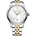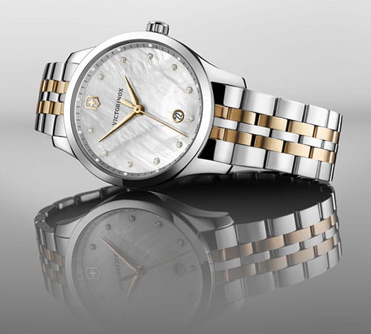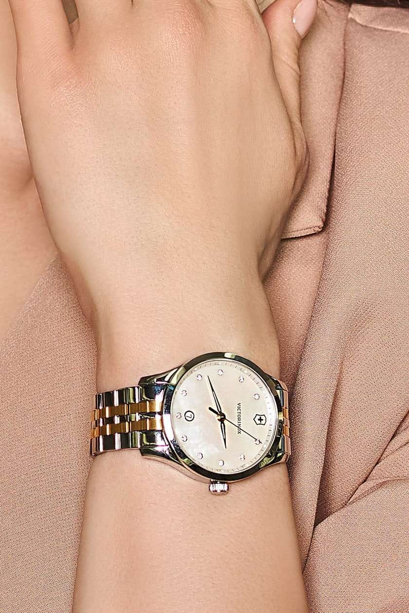 Женские швейцарские часы Victorinox 241831 выполнены в сдержанном функциональном формате без акцента на декор. Корпус из нержавеющей стали диаметром 35 мм подходит для постоянного ношения и не утяжеляет посадку на запястье. Циферблат с сапфировым стекломСапфировое стеклоПрочный и надёжный материал из кристалла сапфира синтетического происхождения, характеризующийся особой твёрдостью и устойчивостью к царапинам и повреждениям. и тройным антибликовым покрытиемАнтибликовое покрытиеСлой оксида металла в 0,13-0,3 микрон, благодаря которому стекло часов не бликует и не отражает свет. Антибликовое покрытие уменьшает отражение света в 10 раз, обеспечивая отличную читаемость показателей циферблата., что снижает отражения и сохраняет чёткость разметки при ярком освещении. Водозащита 100 метров допускает плавание и активный контакт с водой без использования для глубоких погружений. Стальной браслет с PVD-покрытиемPVDУльтратонкое покрытие наносится в технике вакуумного напыления, сочетает в себе нитрид титана особой прочности со слоем золота или оксида хрома. Несёт в себе декоративную или защитную функцию. оснащён застёжкой-бабочкой с кнопкамиЗастёжка "бабочка"Такой вид застёжки дополняется предохранителями, помогающими избежать случайного раскрытия браслета. Обладают изящным исполнением. , обеспечивающей плотную фиксацию и ровное распределение веса. Стрелки имеют люминесцентное покрытиеЛюминесцентное покрытиеПозволяет считывать показания времени в темноте. Производители наносят на стрелки, часовые индексы, безель или поверхность циферблата светонакопительный состав, дающий холодное свечение., позволяющее считывать время в темноте и при слабом внешнем свете.