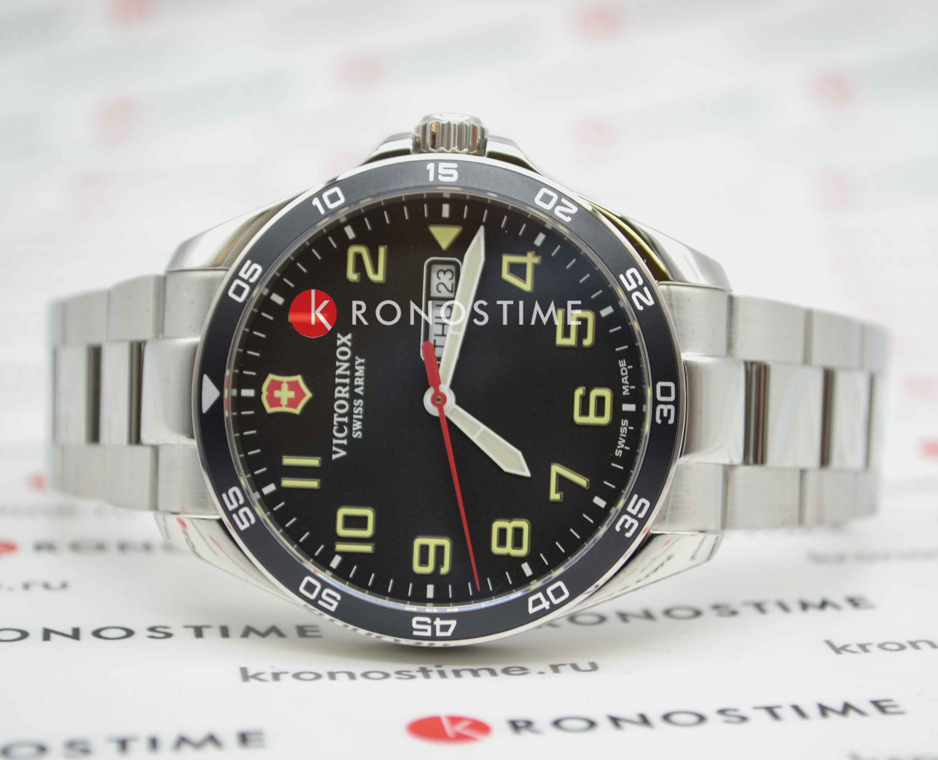 Мужские швейцарские часы Victorinox Fieldforce 241849 с надёжным кварцевым механизмом. Сапфировое стеклоСапфировое стеклоПрочный и надёжный материал из кристалла сапфира синтетического происхождения, характеризующийся особой твёрдостью и устойчивостью к царапинам и повреждениям. с трёхслойным антибликовым покрытием. Корпус часов выполнен из нержавеющей стали 316L. Стальной браслет на раскладной застёжкеРаскладная застёжкаТакой тип застёжки используется только на браслетах из металла. Она никогда не раскрывается полностью, происходит разделение на 2 и более частей. Раскладывающая застёжка снизит вероятность потери часов к минимуму.. Влагозащита: 100 метров, позволит плавать, нырять и заниматься другими водными видами спорта. Окошко даты и дня недели находится в положении 3 часа. Стрелки и метки с люминесцентным покрытиемЛюминесцентное покрытиеПозволяет считывать показания времени в темноте. Производители наносят на стрелки, часовые индексы, безель или поверхность циферблата светонакопительный состав, дающий холодное свечение..