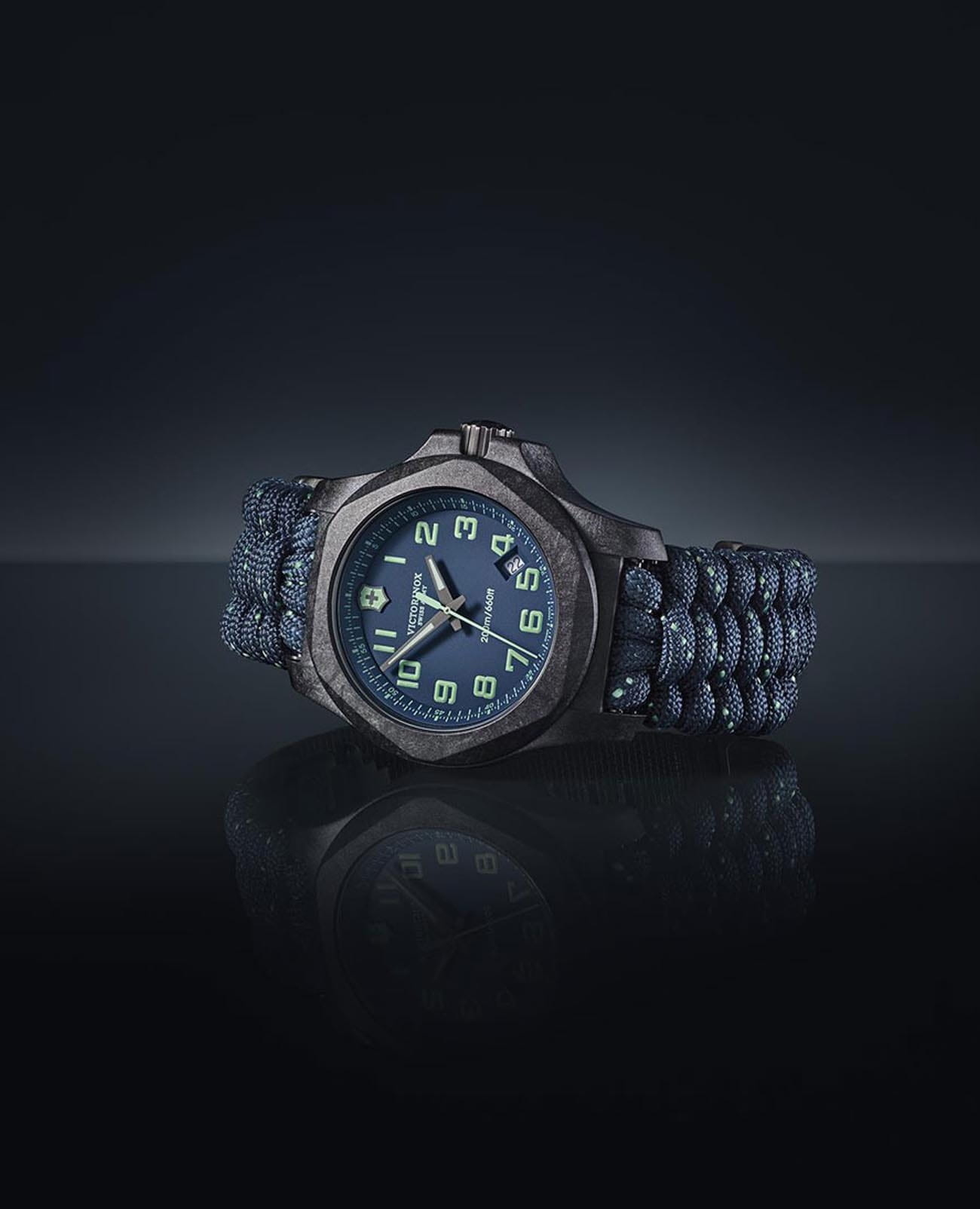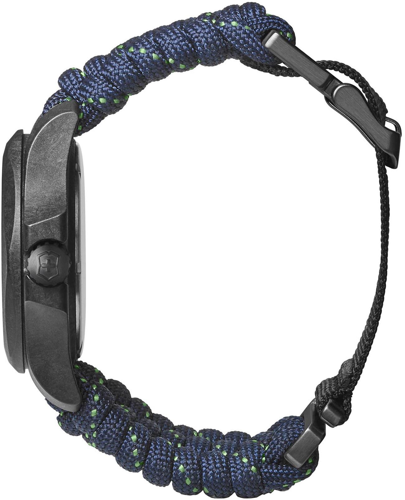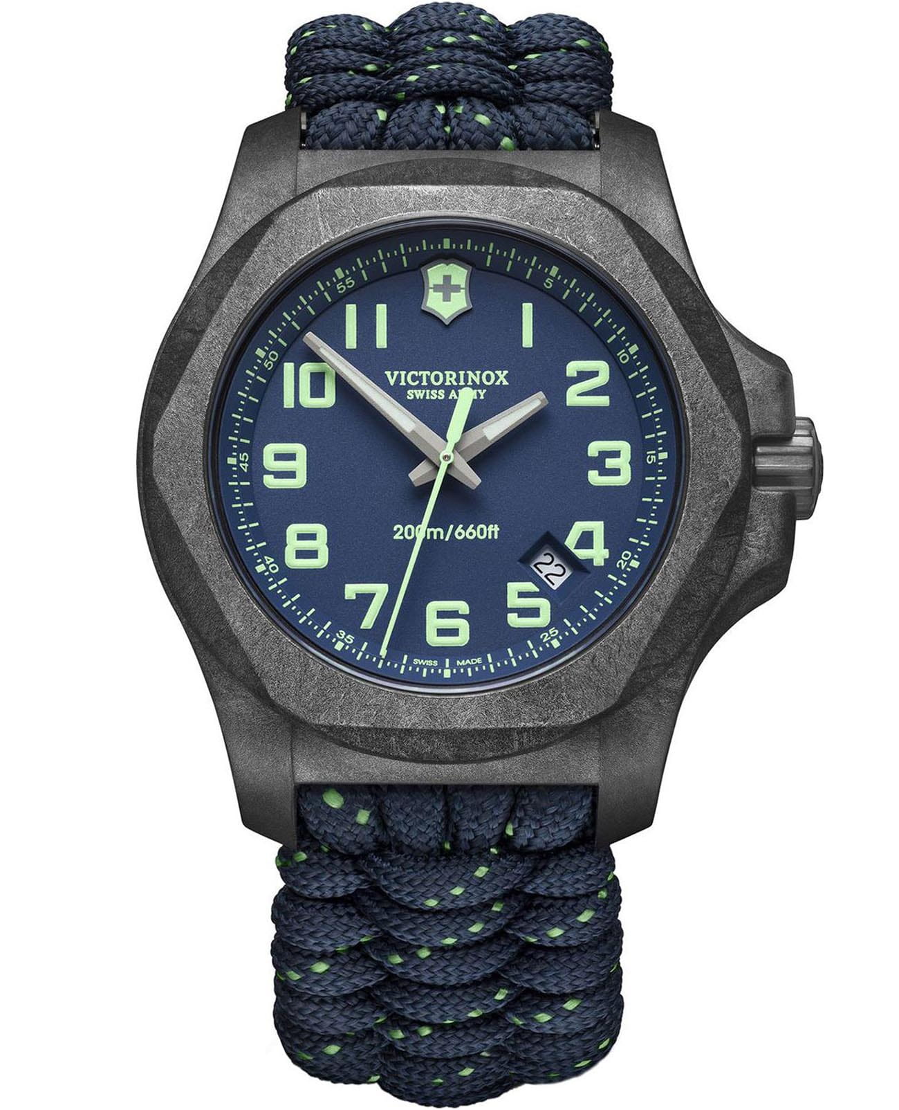 Мужские швейцарские часы Victorinox I.N.O.X. Carbon 241860. Сапфировое стеклоСапфировое стеклоПрочный и надёжный материал из кристалла сапфира синтетического происхождения, характеризующийся особой твёрдостью и устойчивостью к царапинам и повреждениям. с трёхслойным антибликовым покрытием. Корпус часов выполнен из карбона. Ремешок изготовлен из плетенной паракордовой стропы, длиной 2,5 метра и способной выдержать 250 кг. Влагозащита: 200 метров, позволит плавать, нырять и заниматься другими водными видами спорта. Окошко даты находится в положении между 4 и 5 часов. Стрелки и метки с люминесцентным покрытиемЛюминесцентное покрытиеПозволяет считывать показания времени в темноте. Производители наносят на стрелки, часовые индексы, безель или поверхность циферблата светонакопительный состав, дающий холодное свечение.. В комплект часов входят съемный защитный бампер и сменный каучуковый ремешок!