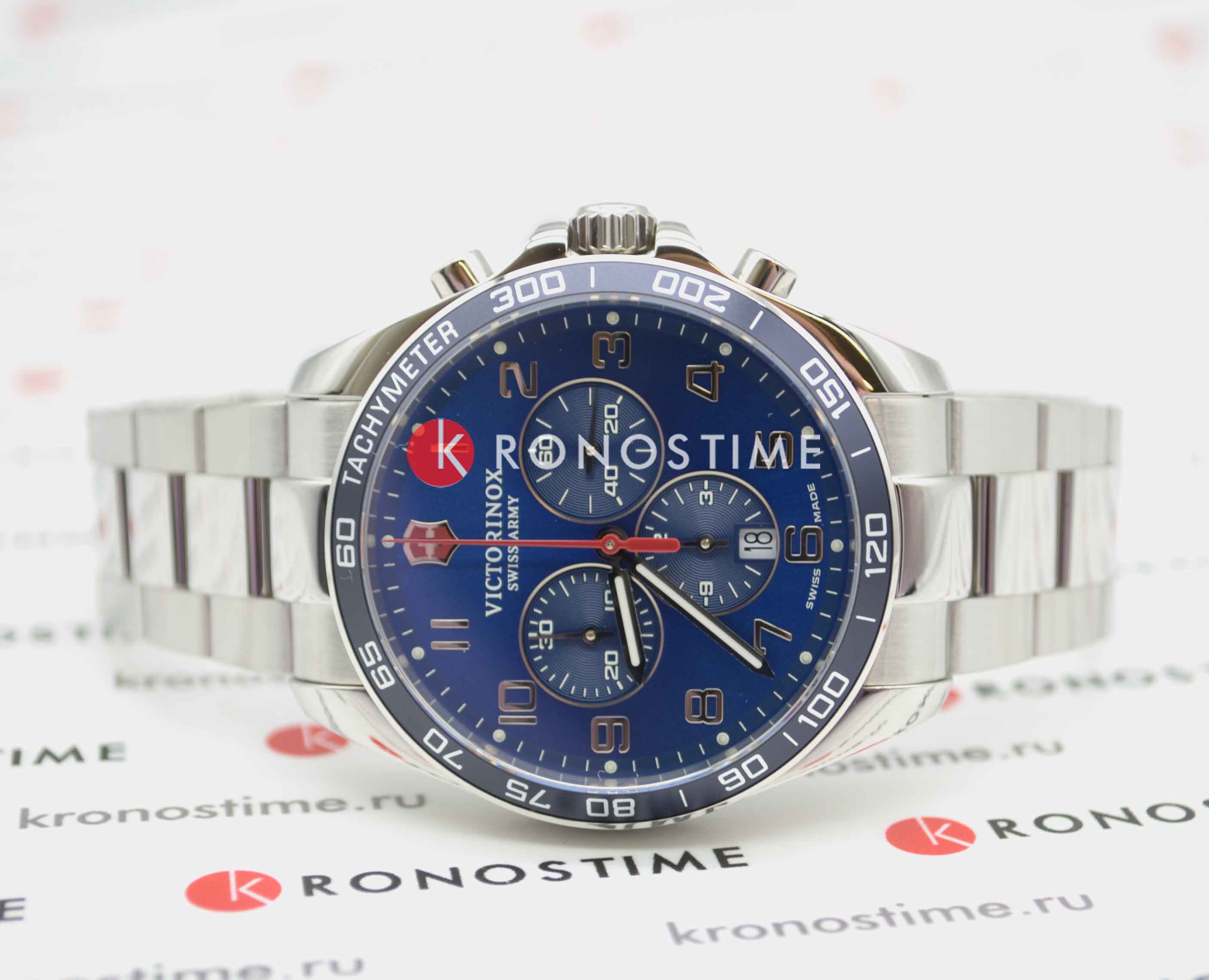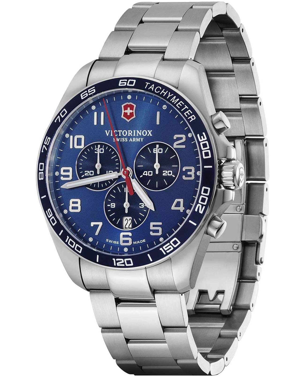 Мужские швейцарские часы-хронографХронографФункция позволяет измерять отрезки времени с особой точностью: часы, минуты, секунды. Верным признаком хронографа является наличие на циферблате 3 дополнительных окошек-счётчиков. Victorinox Fieldforce Chronograph 241901 с надёжным кварцевым механизмом. Сапфировое стеклоСапфировое стеклоПрочный и надёжный материал из кристалла сапфира синтетического происхождения, характеризующийся особой твёрдостью и устойчивостью к царапинам и повреждениям. с трёхслойным антибликовым покрытием. Корпус часов выполнен из нержавеющей стали 316L. Стальной браслет на раскладной застёжкеРаскладная застёжкаТакой тип застёжки используется только на браслетах из металла. Она никогда не раскрывается полностью, происходит разделение на 2 и более частей. Раскладывающая застёжка снизит вероятность потери часов к минимуму.. Влагозащита: 100 метров, позволит плавать, нырять и заниматься другими водными видами спорта. Окошко даты находится в положении 6 часов, стрелки и метки с люминесцентным покрытиемЛюминесцентное покрытиеПозволяет считывать показания времени в темноте. Производители наносят на стрелки, часовые индексы, безель или поверхность циферблата светонакопительный состав, дающий холодное свечение., тахиметрТахиметрРазмеченная шкала, располагается на ободке или безеле часов. Тахиметр позволяет рассчитать скорость на определённом участке пути, расстояние измеряется в километрах или милях..