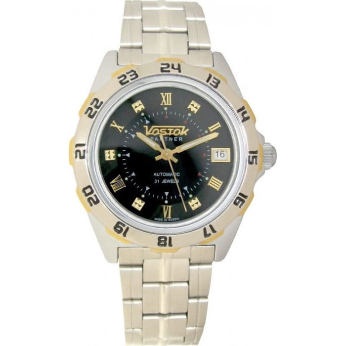 Элегантные часы, идеально подходящие для повседневного образа, будут актуальны в любой обстановке. Партнер. В механизме 31 камень, частота 19800 полуколебаний в час. Запас хода 31 час. Противоударное устройство оси баланса. 12-ти и 24-х часовой формат времени. Вращающийся безель. Заводная головка с защитой. Браслет с раскладывающейся застежкой. Застежка с системой блокировки.
