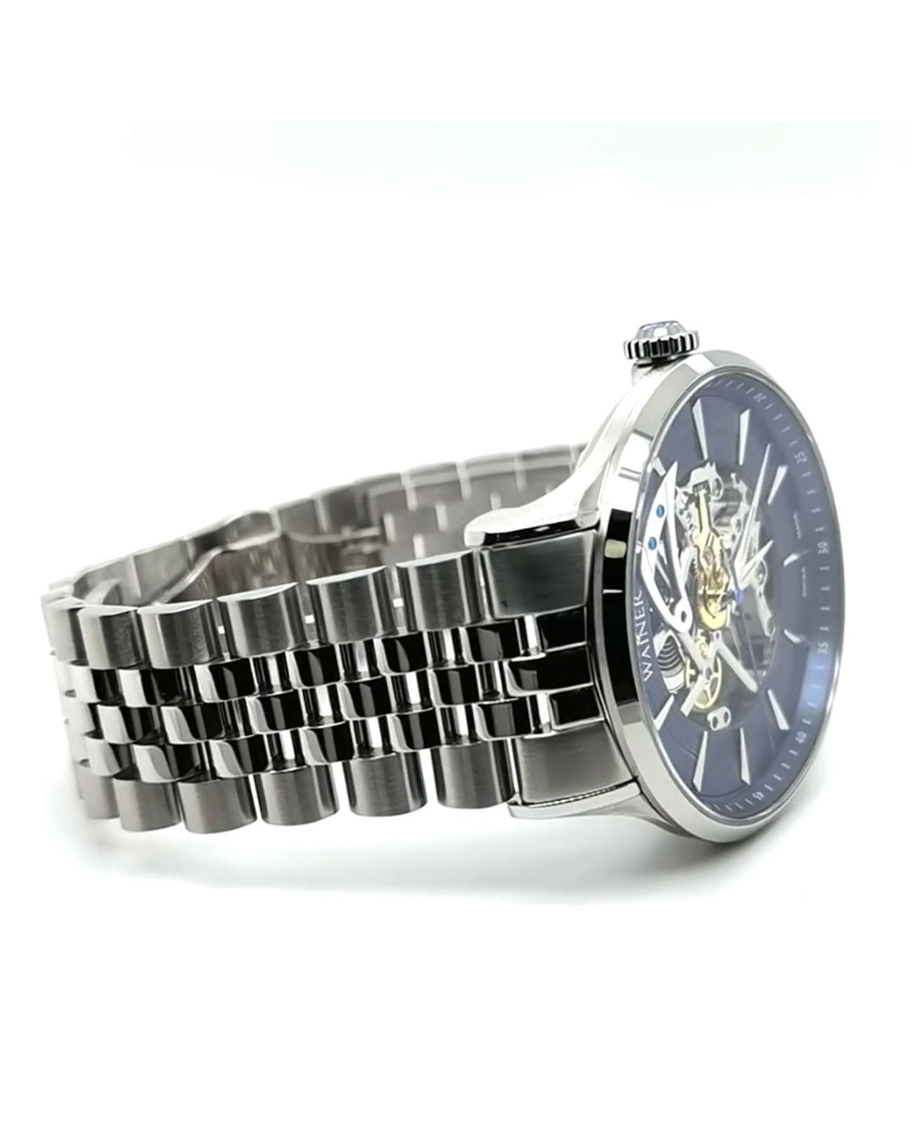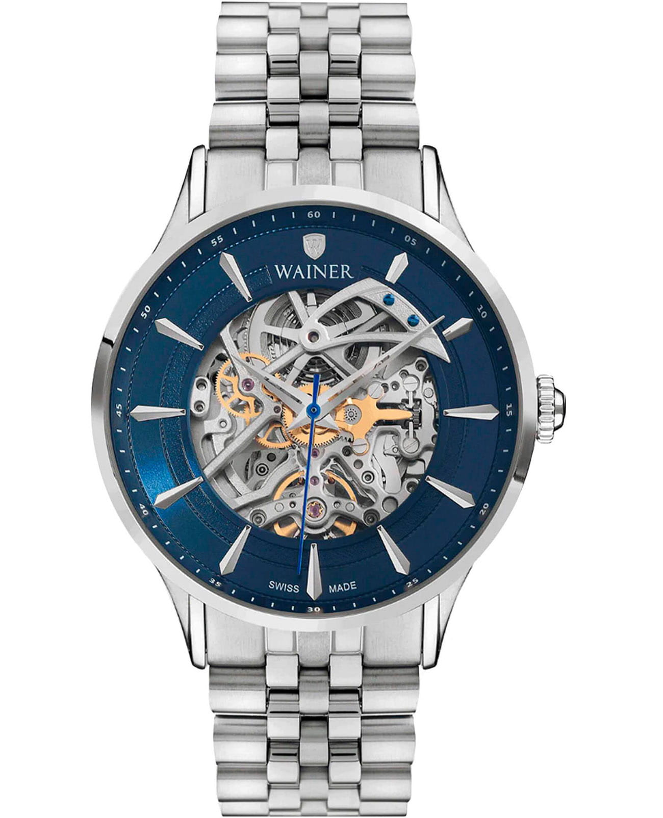 Механические часы-скелетоны Wainer WA.25705-B. Корпус и браслет выполнены из нержавеющей стали 316L. Сапфировое стеклоСапфировое стеклоПрочный и надёжный материал из кристалла сапфира синтетического происхождения, характеризующийся особой твёрдостью и устойчивостью к царапинам и повреждениям.. Водозащита: 50 метров, позволит защитить корпус от случайных брызг или капель дождя. Браслет на раскладной застёжкеРаскладная застёжкаТакой тип застёжки используется только на браслетах из металла. Она никогда не раскрывается полностью, происходит разделение на 2 и более частей. Раскладывающая застёжка снизит вероятность потери часов к минимуму..