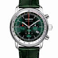 Мужские наручные часы-хронографХронографФункция позволяет измерять отрезки времени с особой точностью: часы, минуты, секунды. Верным признаком хронографа является наличие на циферблате 3 дополнительных окошек-счётчиков. Zeppelin 88884 из коллекции LZ14 Marine сочетают в себе классический дизайн и надежность современных технологий. Модель обладает круглым корпусом диаметром 42 мм, изготовленным из нержавеющей стали, что обеспечивает высокую устойчивость к внешним воздействиям. Браслет выполнен из натуральной кожи, гарантирующей комфортное ношение. Зеленый циферблат с серебристыми светящимися индексами и люминесцентными стрелками оснащен окном даты на «4 часах». Для защиты используется минеральное стеклоМинеральное стеклоМинеральное стекло представляет собой искусственно выращенный минерал кварца. Такое стекло отличается особой устойчивостью к повреждениям и царапинам. Уступает по некоторым качествам сапфировому стеклу., обеспечивающее прочную защиту от царапин. Часы работают на кварцевом механизме Ronda 5030.D швейцарского производства, что гарантирует точное время без необходимости подзаводки. Модель также является хронографом, оснащенным функцией секундомераСекундомерСекундоме́р — прибор, способный измерять интервалы времени с точностью до долей секунды., делая ее идеальной для активного образа жизни. Водонепроницаемость часов достигает 5 атмосфер (50 метров), что позволяет использовать их во время плавания на поверхности, однако не рекомендуется для глубоководного дайвинга или занятий водными видами спорта с высоким уровнем активности.